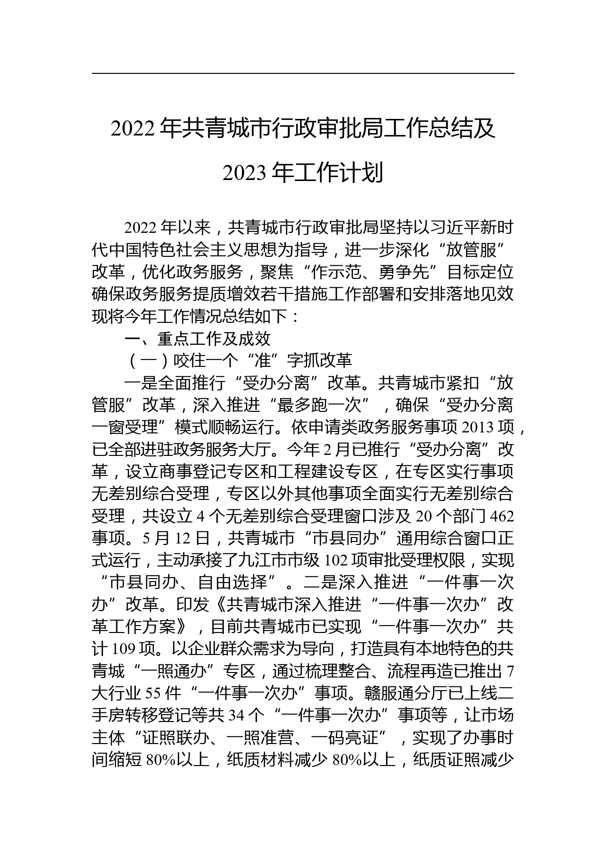 2022年共青城市行政審批局工作總結(jié)及2023年工作計(jì)劃VIP免費(fèi)