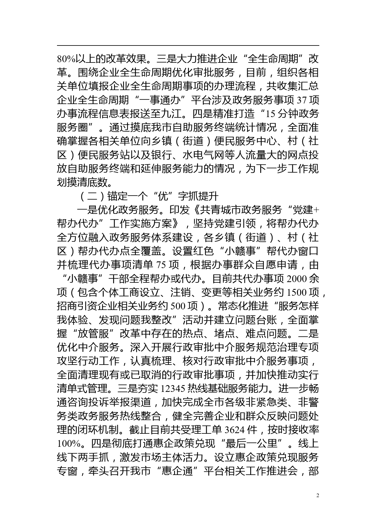 2022年共青城市行政審批局工作總結(jié)及2023年工作計(jì)劃2022年以來,共青城市行政審批局堅(jiān)持以習(xí)近平新時(shí)代中國特色社會主義思想為指導(dǎo),進(jìn)一步深化“放管服”改革,優(yōu)化政務(wù)服務(wù),聚焦“作示范、勇爭先”目標(biāo)定位確保政務(wù)服務(wù)提質(zhì)增效若干措施工作部署和安排落地見效現(xiàn)將今年工作情況總結(jié)如下:一、重點(diǎn)工作及成效(一)咬住一個(gè)“準(zhǔn)”字抓改革一是全面推行“受辦分離”改革。共青城市緊扣“放管服”改革,深入推進(jìn)“最多跑一次”,確?!笆苻k分離一窗受理”模式順暢運(yùn)行。依申請類政務(wù)服務(wù)事項(xiàng)2013項(xiàng),已全部進(jìn)駐政務(wù)服務(wù)大廳。今年2月已推行“受辦分離”改革,設(shè)立商事登...