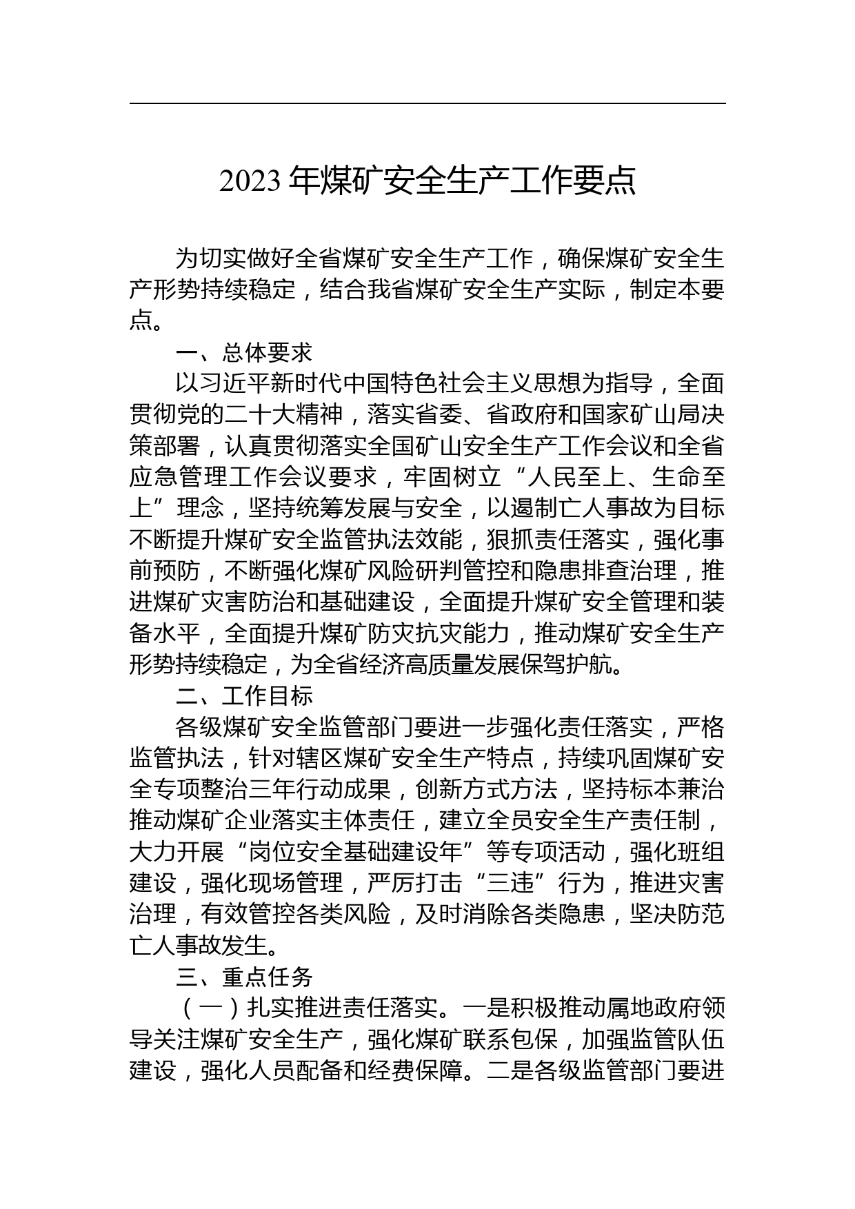 2023年煤礦安全生產(chǎn)工作要點(diǎn)為切實(shí)做好全省煤礦安全生產(chǎn)工作,確保煤礦安全生產(chǎn)形勢持續(xù)穩(wěn)定,結(jié)合我省煤礦安全生產(chǎn)實(shí)際,制定本要點(diǎn)。一、總體要求以習(xí)近平新時代中國特色社會主義思想為指導(dǎo),全面貫徹黨的二十大精神,落實(shí)省委、省政府和國家礦山局決策部署,認(rèn)真貫徹落實(shí)全國礦山安全生產(chǎn)工作會議和全省應(yīng)急管理工作會議要求,牢固樹立“人民至上、生命至上”理念,堅持統(tǒng)籌發(fā)展與安全,以遏制亡人事故為目標(biāo)不斷提升煤礦安全監(jiān)管執(zhí)法效能,狠抓責(zé)任落實(shí),強(qiáng)化事前預(yù)防,不斷強(qiáng)化煤礦風(fēng)險研判管控和隱患排查治理,推進(jìn)煤礦災(zāi)害防治和基礎(chǔ)建設(shè),全面提升煤礦安全管理和...