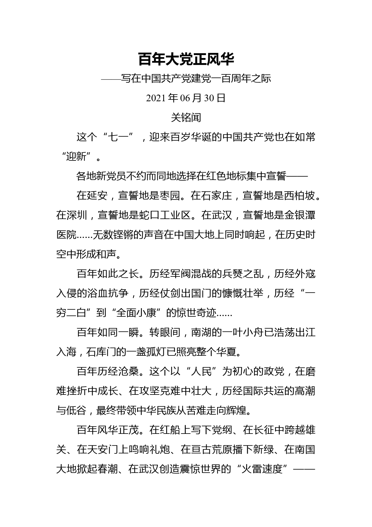 百年大黨正風(fēng)華——寫在中國(guó)共產(chǎn)黨建黨一百周年之際2021年06月30日?關(guān)銘聞?這個(gè)“七一”,迎來(lái)百歲華誕的中國(guó)共產(chǎn)黨也在如?!坝隆薄?各地新黨員不約而同地選擇在紅色地標(biāo)集中宣誓——?在延安,宣誓地是棗園。在石家莊,宣誓地是西柏坡。在深圳,宣誓地是蛇口工業(yè)區(qū)。在武漢,宣誓地是金銀潭醫(yī)院……無(wú)數(shù)鏗鏘的聲音在中國(guó)大地上同時(shí)響起,在歷史時(shí)空中形成和聲。?百年如此之長(zhǎng)。歷經(jīng)軍閥混戰(zhàn)的兵燹之亂,歷經(jīng)外寇入侵的浴血抗?fàn)帲瑲v經(jīng)仗劍出國(guó)門的慷慨壯舉,歷經(jīng)“一窮二白”到“全面小康”的驚世奇跡……?百年如同一瞬。轉(zhuǎn)眼間,南湖的一葉小舟已浩蕩出江入海,...