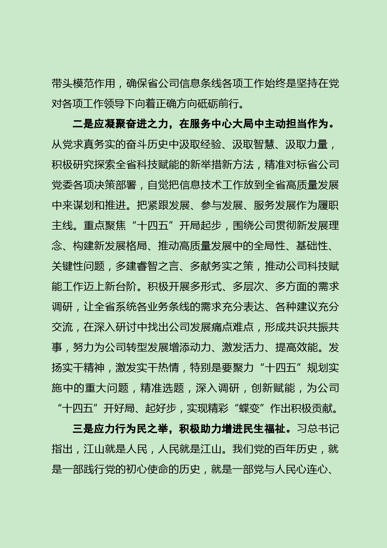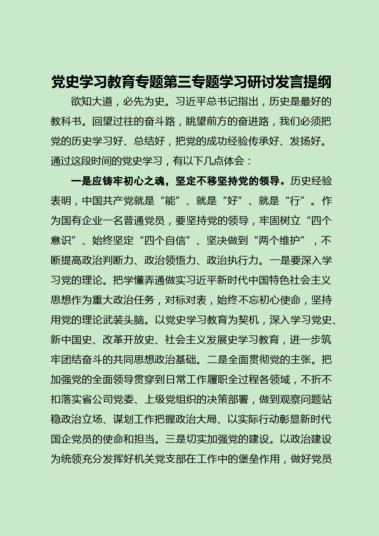 黨史學(xué)習(xí)教育專題第三專題學(xué)習(xí)研討發(fā)言提綱欲知大道,必先為史。習(xí)近平總書記指出,歷史是最好的教科書?;赝^往的奮斗路,眺望前方的奮進(jìn)路,我們必須把黨的歷史學(xué)習(xí)好、總結(jié)好,把黨的成功經(jīng)驗(yàn)傳承好、發(fā)揚(yáng)好。通過這段時(shí)間的黨史學(xué)習(xí),有以下幾點(diǎn)體會(huì):一是應(yīng)鑄牢初心之魂,堅(jiān)定不移堅(jiān)持黨的領(lǐng)導(dǎo)。歷史經(jīng)驗(yàn)表明,中國共產(chǎn)黨就是“能”、就是“好”、就是“行”。作為國有企業(yè)一名普通黨員,要堅(jiān)持黨的領(lǐng)導(dǎo),牢固樹立“四個(gè)意識(shí)”、始終堅(jiān)定“四個(gè)自信”、堅(jiān)決做到“兩個(gè)維護(hù)”,不斷提高政治判斷力、政治領(lǐng)悟力、政治執(zhí)行力。一是要深入學(xué)習(xí)黨的理論。把學(xué)懂弄通做實(shí)...