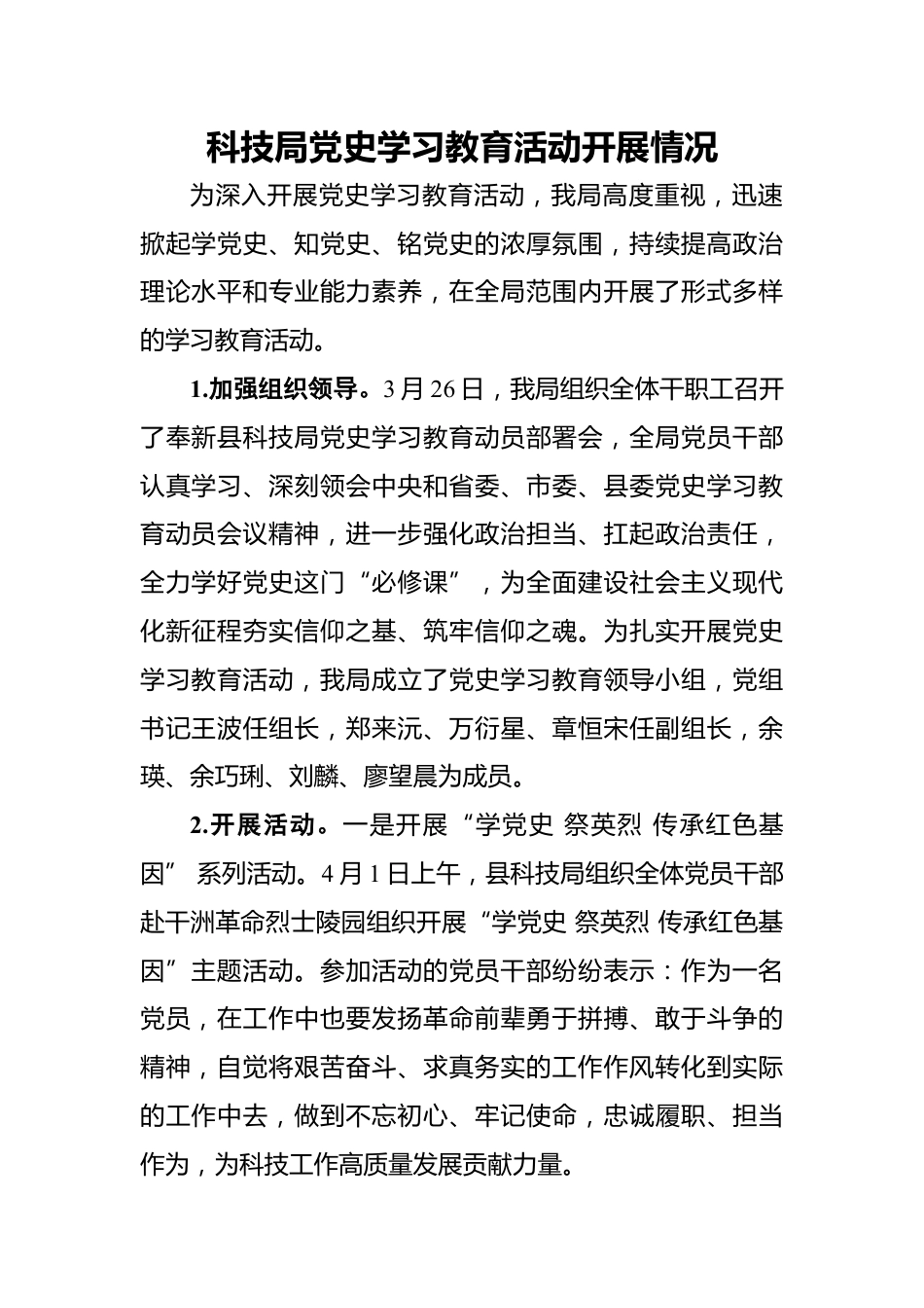 科技局黨史學習教育活動開展情況為深入開展黨史學習教育活動,我局高度重視,迅速掀起學黨史、知黨史、銘黨史的濃厚氛圍,持續(xù)提高政治理論水平和專業(yè)能力素養(yǎng),在全局范圍內開展了形式多樣的學習教育活動。1.加強組織領導。3月26日,我局組織全體干職工召開了奉新縣科技局黨史學習教育動員部署會,全局黨員干部認真學習、深刻領會中央和省委、市委、縣委黨史學習教育動員會議精神,進一步強化政治擔當、扛起政治責任,全力學好黨史這門“必修課”,為全面建設社會主義現(xiàn)代化新征程夯實信仰之基、筑牢信仰之魂。為扎實開展黨史學習教育活動,我局成立了黨史學習教育領導...