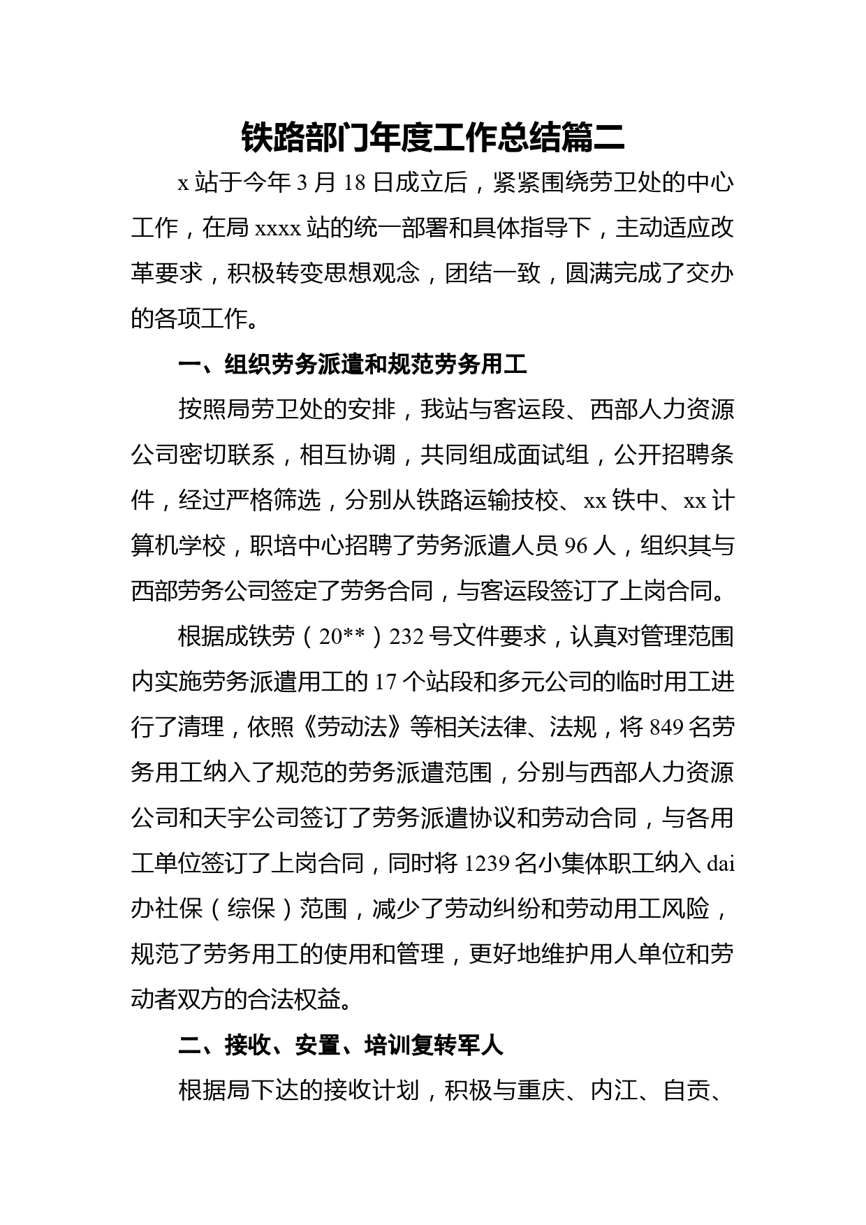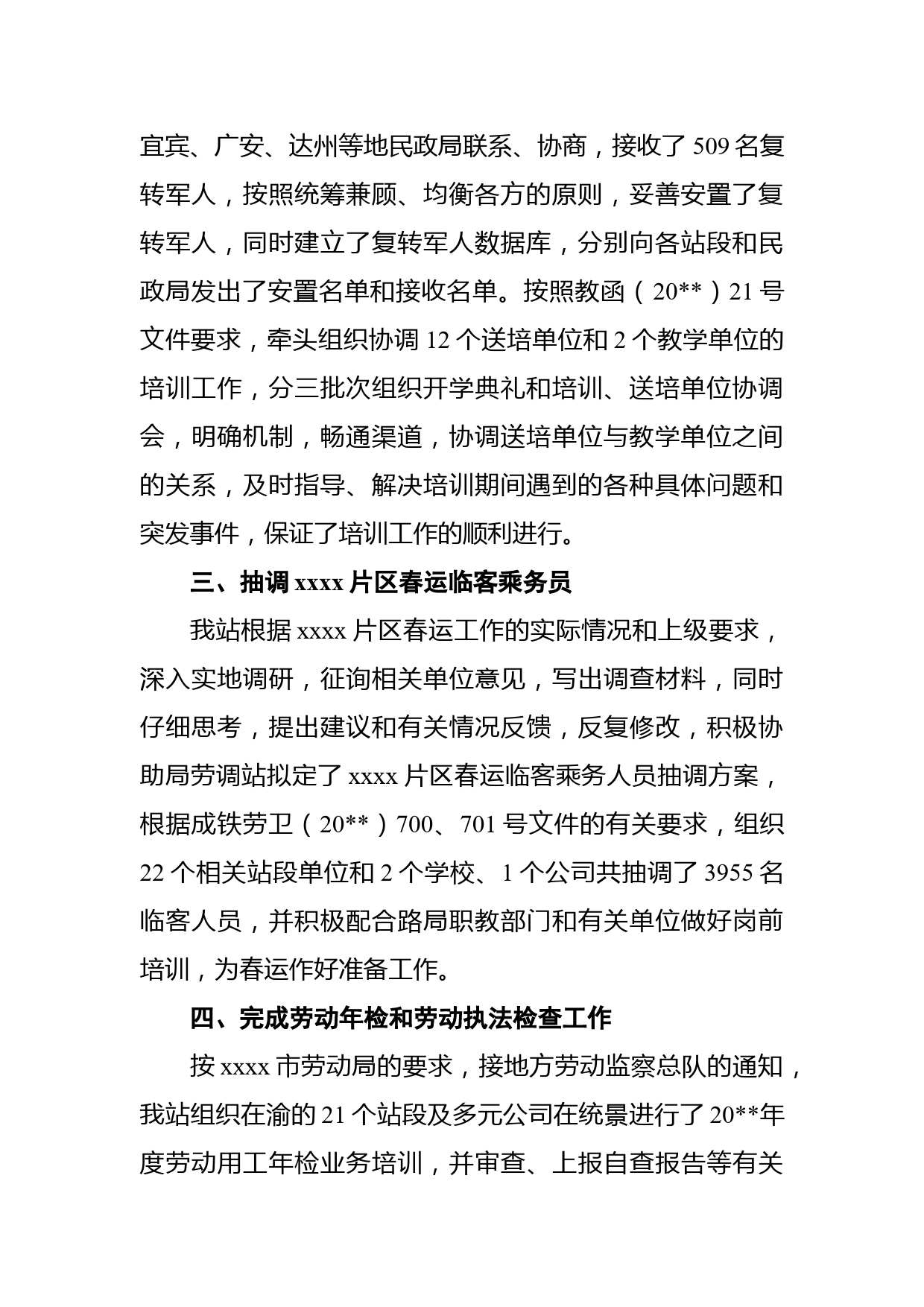 鐵路部門年度工作總結(jié)篇二?x站于今年3月18日成立后,緊緊圍繞勞衛(wèi)處的中心工作,在局xxxx站的統(tǒng)一部署和具體指導(dǎo)下,主動適應(yīng)改革要求,積極轉(zhuǎn)變思想觀念,團結(jié)一致,圓滿完成了交辦的各項工作。?一、組織勞務(wù)派遣和規(guī)范勞務(wù)用工?按照局勞衛(wèi)處的安排,我站與客運段、西部人力資源公司密切聯(lián)系,相互協(xié)調(diào),共同組成面試組,公開招聘條件,經(jīng)過嚴(yán)格篩選,分別從鐵路運輸技校、xx鐵中、xx計算機學(xué)校,職培中心招聘了勞務(wù)派遣人員96人,組織其與西部勞務(wù)公司簽定了勞務(wù)合同,與客運段簽訂了上崗合同。?根據(jù)成鐵勞(20)232號文件要求,認(rèn)真對管理范圍內(nèi)實施勞務(wù)派遣用工...