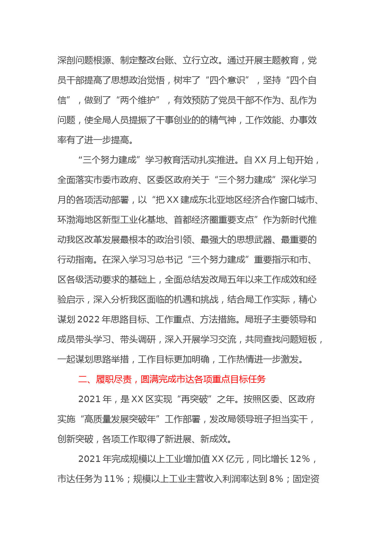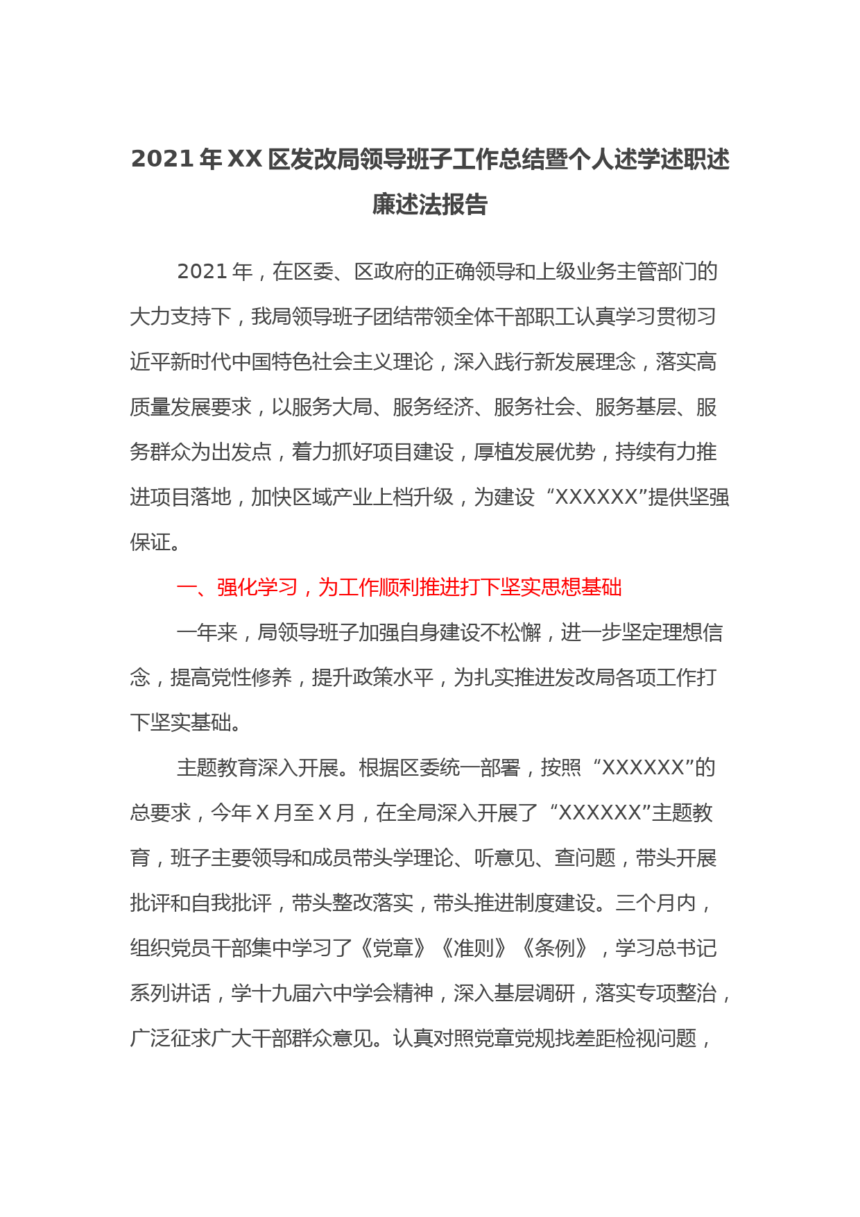 2021年XX區(qū)發(fā)改局領導班子工作總結暨個人述學述職述廉述法報告VIP免費