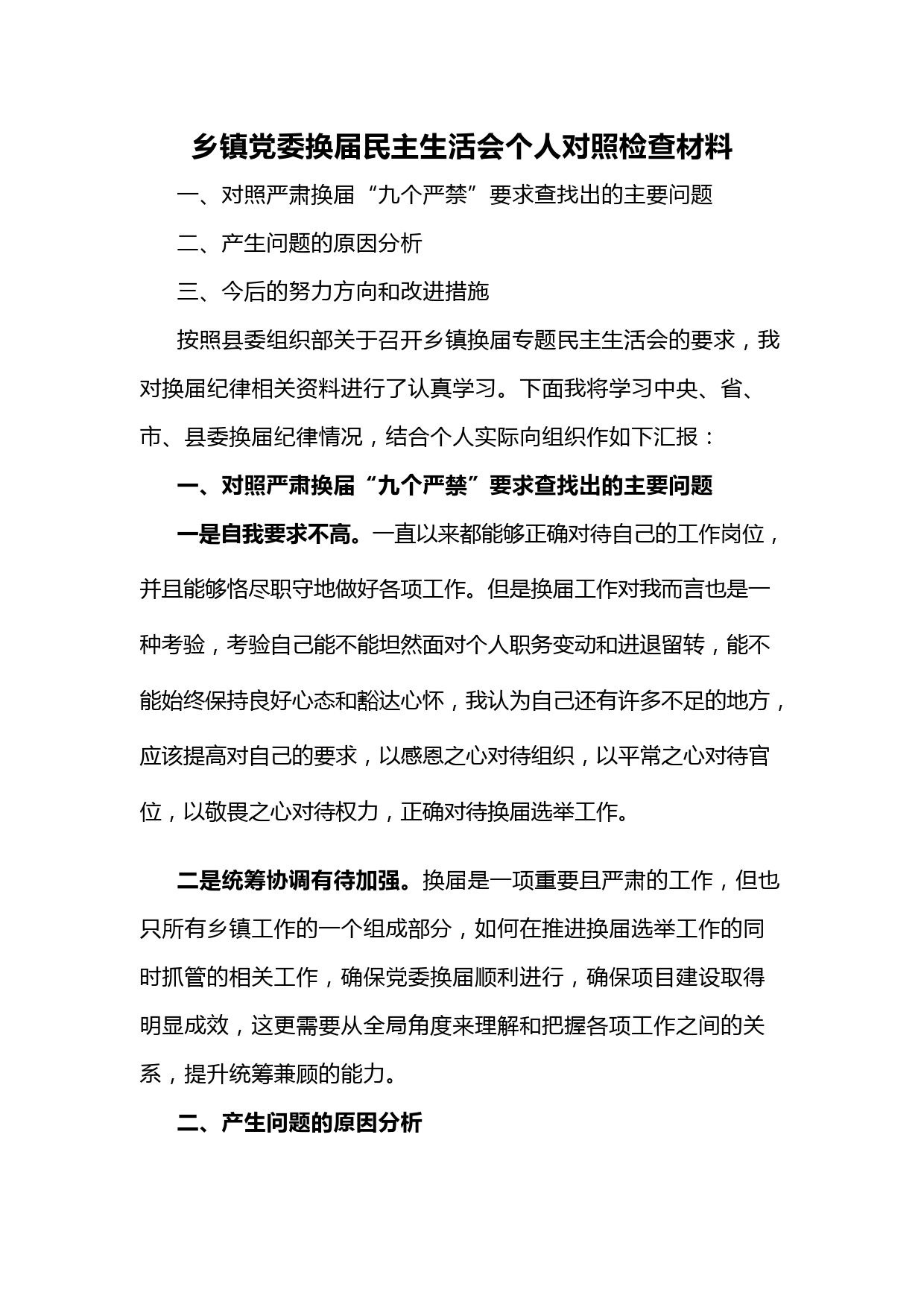 鄉(xiāng)鎮(zhèn)黨委換屆民主生活會個人對照檢查材料一、對照嚴肅換屆“九個嚴禁”要求查找出的主要問題二、產生問題的原因分析三、今后的努力方向和改進措施按照縣委組織部關于召開鄉(xiāng)鎮(zhèn)換屆專題民主生活會的要求,我對換屆紀律相關資料進行了認真學習。下面我將學習中央、省、市、縣委換屆紀律情況,結合個人實際向組織作如下匯報:一、對照嚴肅換屆“九個嚴禁”要求查找出的主要問題一是自我要求不高。一直以來都能夠正確對待自己的工作崗位,并且能夠恪盡職守地做好各項工作。但是換屆工作對我而言也是一種考驗,考驗自己能不能坦然面對個人職務變動和進退留轉,能不能始終保持良...