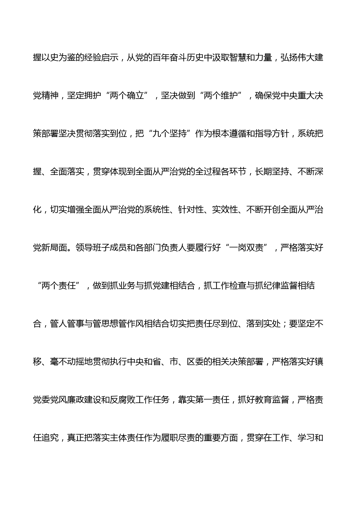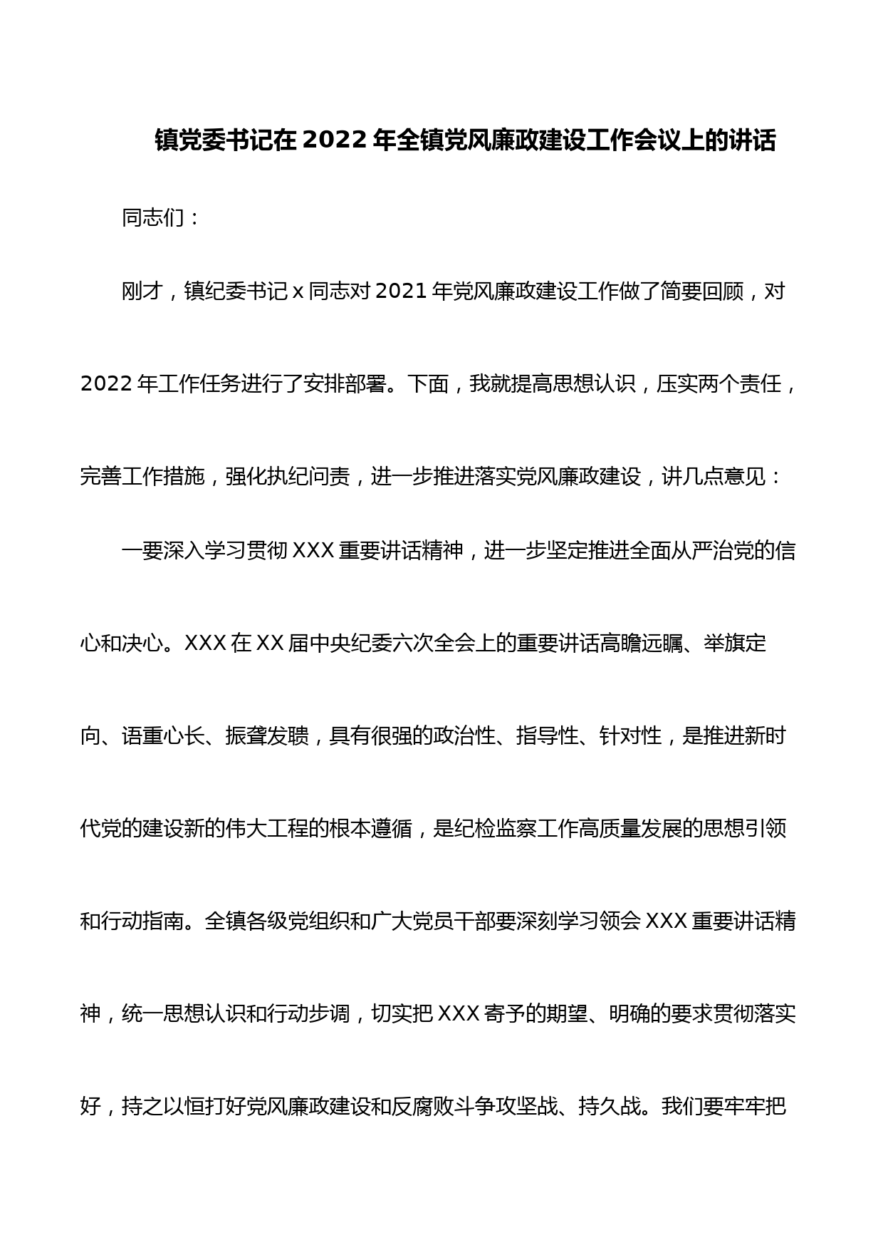 鎮(zhèn)黨委書記在2022年全鎮(zhèn)黨風(fēng)廉政建設(shè)工作會議上的講話同志們:剛才,鎮(zhèn)紀(jì)委書記x同志對2021年黨風(fēng)廉政建設(shè)工作做了簡要回顧,對2022年工作任務(wù)進行了安排部署。下面,我就提高思想認(rèn)識,壓實兩個責(zé)任,完善工作措施,強化執(zhí)紀(jì)問責(zé),進一步推進落實黨風(fēng)廉政建設(shè),講幾點意見:一要深入學(xué)習(xí)貫徹XXX重要講話精神,進一步堅定推進全面從嚴(yán)治黨的信心和決心。XXX在XX屆中央紀(jì)委六次全會上的重要講話高瞻遠(yuǎn)矚、舉旗定向、語重心長、振聾發(fā)聵,具有很強的政治性、指導(dǎo)性、針對性,是推進新時代黨的建設(shè)新的偉大工程的根本遵循,是紀(jì)檢監(jiān)察工作高質(zhì)量發(fā)展的思想引領(lǐng)和行動指南。...