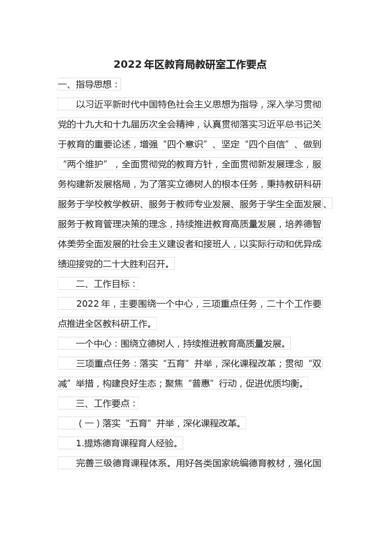 2022年區(qū)教育局教研室工作要點(diǎn)一、指導(dǎo)思想:以習(xí)近平新時(shí)代中國(guó)特色社會(huì)主義思想為指導(dǎo),深入學(xué)習(xí)貫徹黨的十九大和十九屆歷次全會(huì)精神,認(rèn)真貫徹落實(shí)習(xí)近平總書記關(guān)于教育的重要論述,增強(qiáng)“四個(gè)意識(shí)”、堅(jiān)定“四個(gè)自信”、做到“兩個(gè)維護(hù)”,全面貫徹黨的教育方針,全面貫徹新發(fā)展理念,服務(wù)構(gòu)建新發(fā)展格局,為了落實(shí)立德樹人的根本任務(wù),秉持教研科研服務(wù)于學(xué)校教學(xué)教研、服務(wù)于教師專業(yè)發(fā)展、服務(wù)于學(xué)生全面發(fā)展、服務(wù)于教育管理決策的理念,持續(xù)推進(jìn)教育高質(zhì)量發(fā)展,培養(yǎng)德智體美勞全面發(fā)展的社會(huì)主義建設(shè)者和接班人,以實(shí)際行動(dòng)和優(yōu)異成績(jī)迎接黨的二十大勝利召開。...