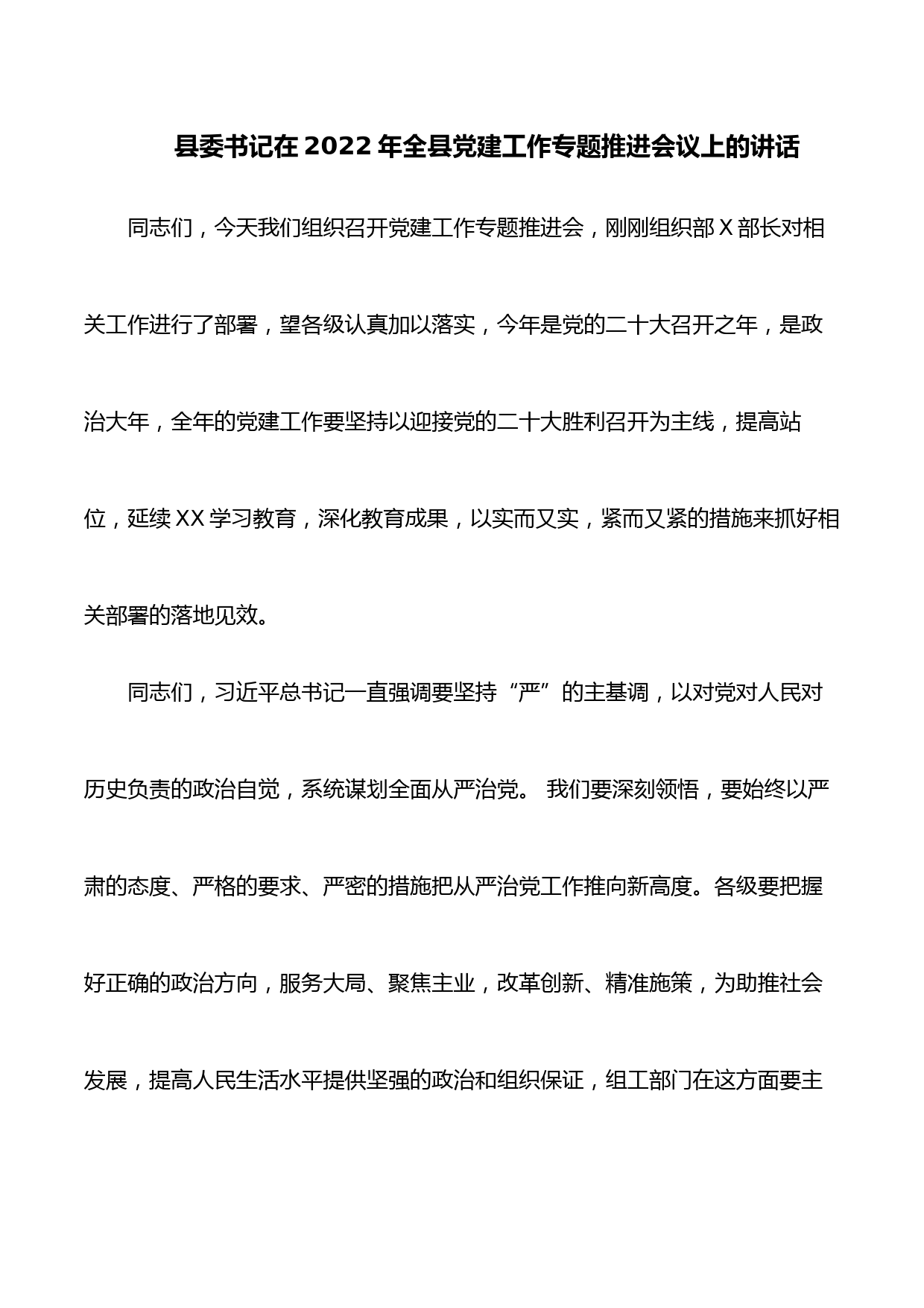 縣委書記在2022年全縣黨建工作專題推進會議上的講話同志們,今天我們組織召開黨建工作專題推進會,剛剛組織部X部長對相關(guān)工作進行了部署,望各級認(rèn)真加以落實,今年是黨的二十大召開之年,是政治大年,全年的黨建工作要堅持以迎接黨的二十大勝利召開為主線,提高站位,延續(xù)XX學(xué)習(xí)教育,深化教育成果,以實而又實,緊而又緊的措施來抓好相關(guān)部署的落地見效。同志們,習(xí)近平總書記一直強調(diào)要堅持“嚴(yán)”的主基調(diào),以對黨對人民對歷史負(fù)責(zé)的政治自覺,系統(tǒng)謀劃全面從嚴(yán)治黨。我們要深刻領(lǐng)悟,要始終以嚴(yán)肅的態(tài)度、嚴(yán)格的要求、嚴(yán)密的措施把從嚴(yán)治黨工作推向新高度。各級要把...