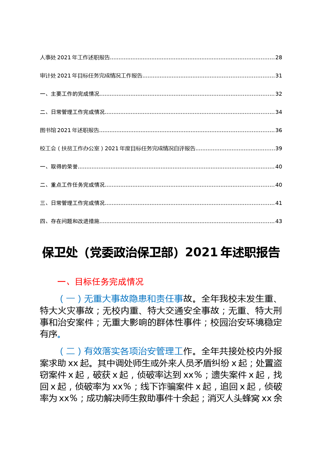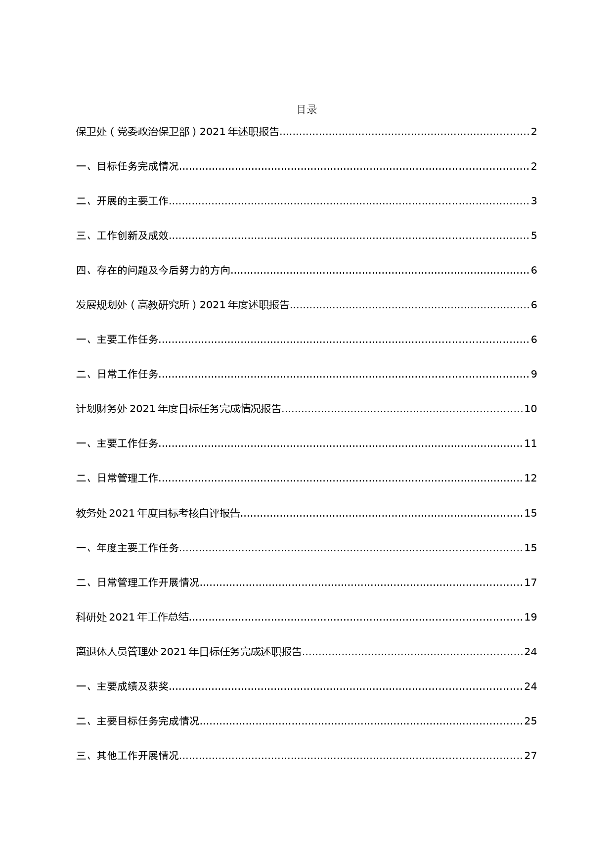 目錄保衛(wèi)處(黨委政治保衛(wèi)部)2021年述職報(bào)告............................................................................2一、目標(biāo)任務(wù)完成情況..........................................................................................................2二、開展的主要工作.............................................................................................................3三、工作創(chuàng)新及成效.............................................................................................................5四、存在的問題及今后努力的方...