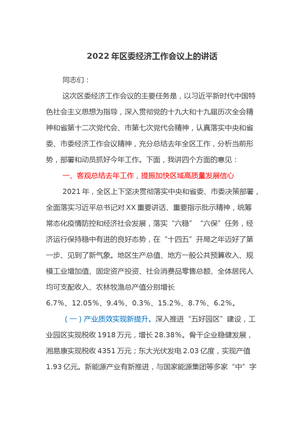 2022年區(qū)委經濟工作會議上的講話VIP免費