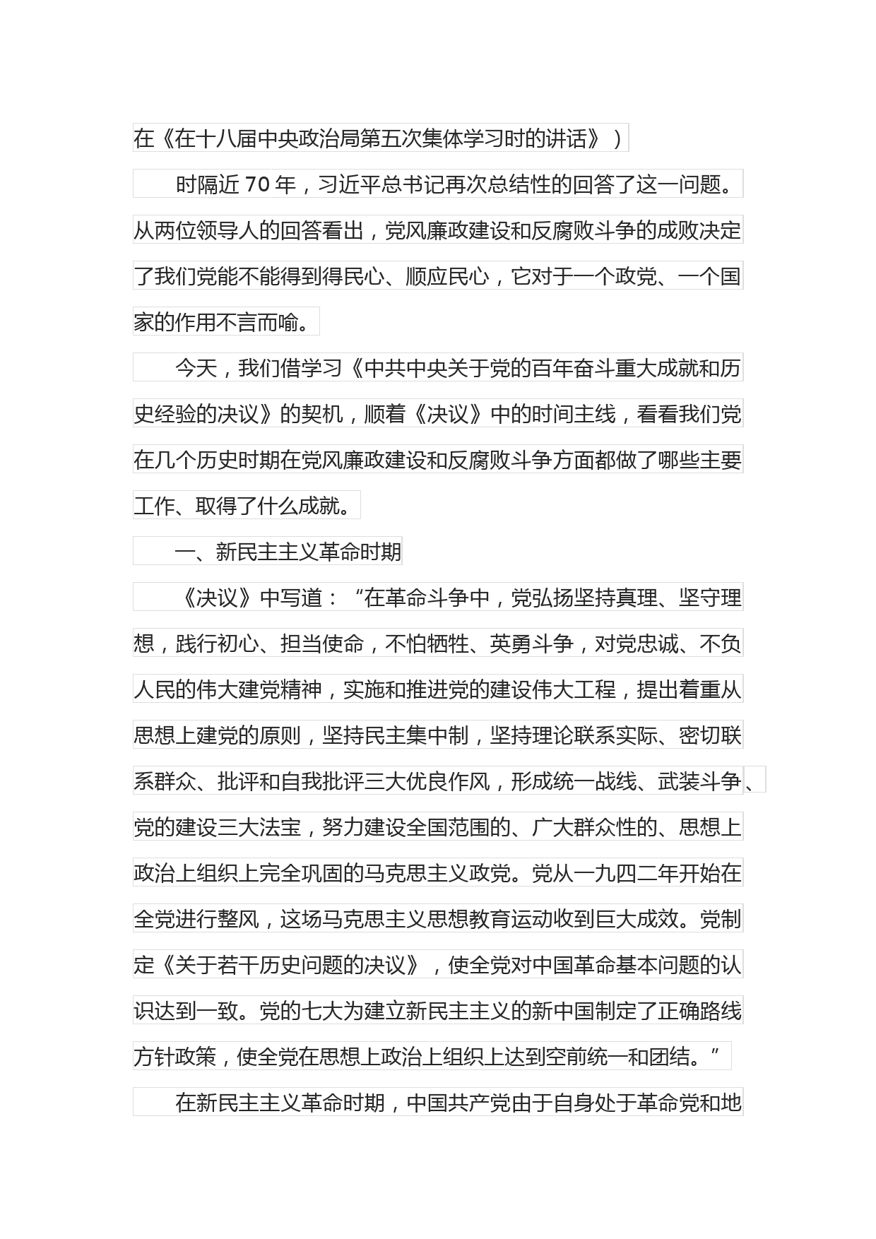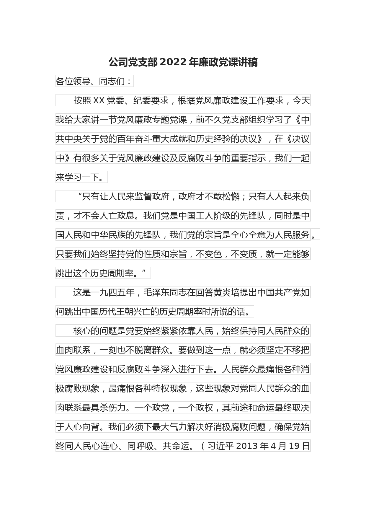 公司黨支部2022年廉政黨課講稿各位領(lǐng)導(dǎo)、同志們:按照XX黨委、紀(jì)委要求,根據(jù)黨風(fēng)廉政建設(shè)工作要求,今天我給大家講一節(jié)黨風(fēng)廉政專題黨課,前不久黨支部組織學(xué)習(xí)了《中共中央關(guān)于黨的百年奮斗重大成就和歷史經(jīng)驗(yàn)的決議》,在《決議中》有很多關(guān)于黨風(fēng)廉政建設(shè)及反腐敗斗爭(zhēng)的重要指示,我們一起來(lái)學(xué)習(xí)一下?!爸挥凶屓嗣駚?lái)監(jiān)督政府,政府才不敢松懈;只有人人起來(lái)負(fù)責(zé),才不會(huì)人亡政息。我們黨是中國(guó)工人階級(jí)的先鋒隊(duì),同時(shí)是中國(guó)人民和中華民族的先鋒隊(duì),我們黨的宗旨是全心全意為人民服務(wù)。只要我們始終堅(jiān)持黨的性質(zhì)和宗旨,不變色,不變質(zhì),就一定能夠跳出這個(gè)歷史周期...