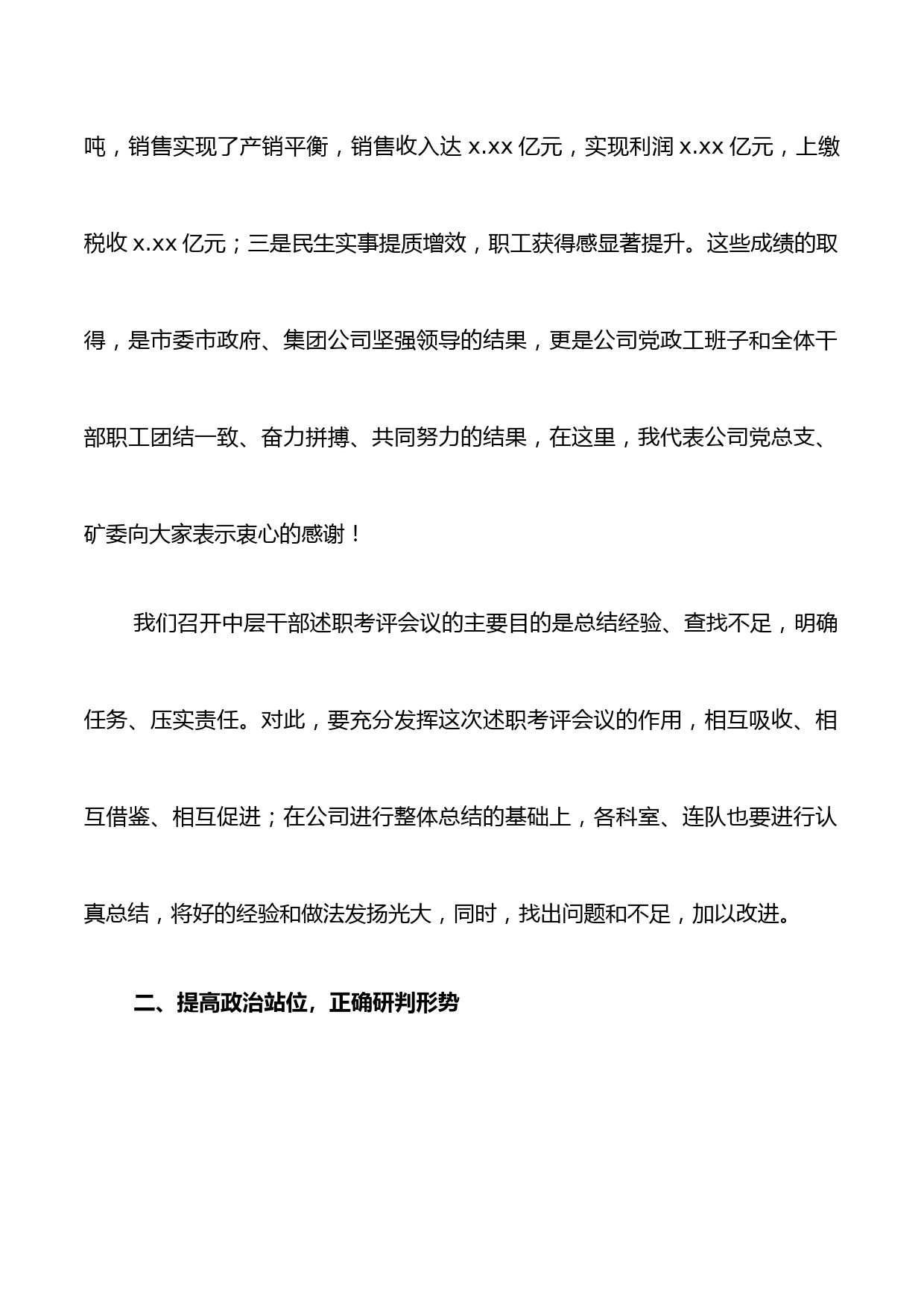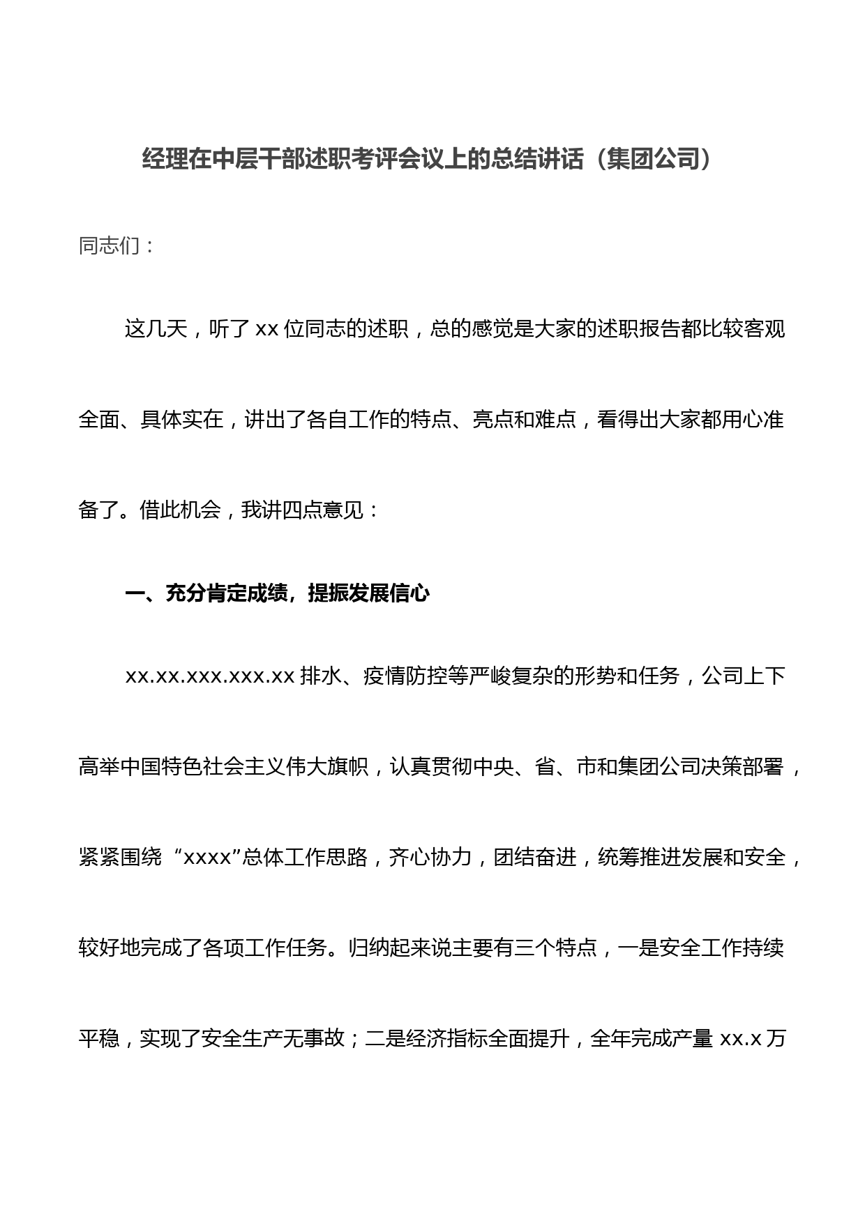 經(jīng)理在中層干部述職考評會(huì)議上的總結(jié)講話(集團(tuán)公司)同志們:這幾天,聽了xx位同志的述職,總的感覺是大家的述職報(bào)告都比較客觀全面、具體實(shí)在,講出了各自工作的特點(diǎn)、亮點(diǎn)和難點(diǎn),看得出大家都用心準(zhǔn)備了。借此機(jī)會(huì),我講四點(diǎn)意見:一、充分肯定成績,提振發(fā)展信心xx.xx.xxx.xxx.xx排水、疫情防控等嚴(yán)峻復(fù)雜的形勢和任務(wù),公司上下高舉中國特色社會(huì)主義偉大旗幟,認(rèn)真貫徹中央、省、市和集團(tuán)公司決策部署,緊緊圍繞“xxxx”總體工作思路,齊心協(xié)力,團(tuán)結(jié)奮進(jìn),統(tǒng)籌推進(jìn)發(fā)展和安全,較好地完成了各項(xiàng)工作任務(wù)。歸納起來說主要有三個(gè)特點(diǎn),一是安全工作持續(xù)平穩(wěn),實(shí)現(xiàn)了...