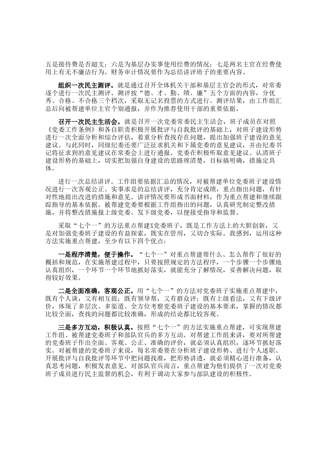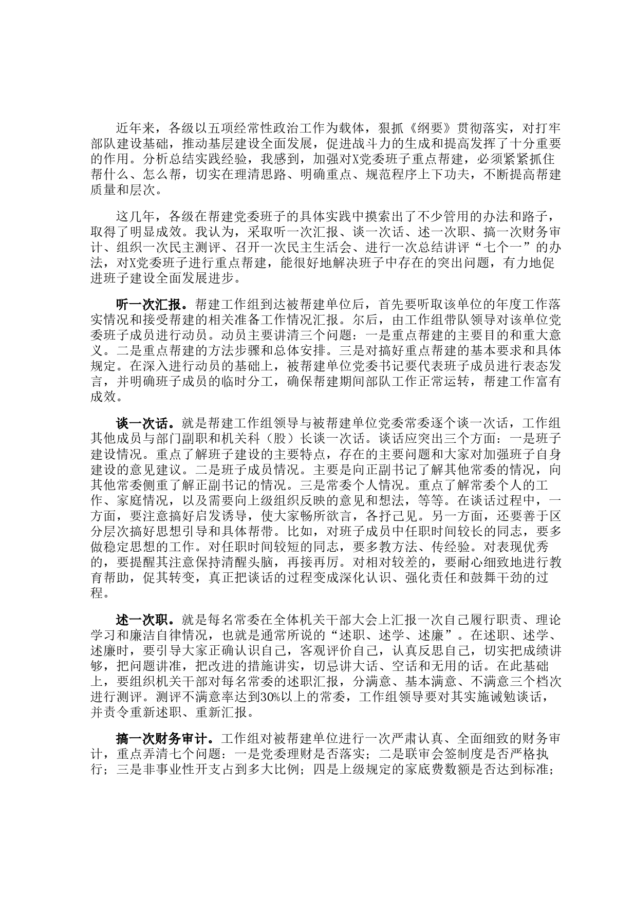 近年來(lái),各級(jí)以五項(xiàng)經(jīng)常性政治工作為載體,狠抓《綱要》貫徹落實(shí),對(duì)打牢部隊(duì)建設(shè)基礎(chǔ),推動(dòng)基層建設(shè)全面發(fā)展,促進(jìn)戰(zhàn)斗力的生成和提高發(fā)揮了十分重要的作用。分析總結(jié)實(shí)踐經(jīng)驗(yàn),我感到,加強(qiáng)對(duì)X黨委班子重點(diǎn)幫建,必須緊緊抓住幫什么、怎么幫,切實(shí)在理清思路、明確重點(diǎn)、規(guī)范程序上下功夫,不斷提高幫建質(zhì)量和層次。這幾年,各級(jí)在幫建黨委班子的具體實(shí)踐中摸索出了不少管用的辦法和路子,取得了明顯成效。我認(rèn)為,采取聽(tīng)一次匯報(bào)、談一次話(huà)、述一次職、搞一次財(cái)務(wù)審計(jì)、組織一次民主測(cè)評(píng)、召開(kāi)一次民主生活會(huì)、進(jìn)行一次總結(jié)講評(píng)“七個(gè)一”的辦法,對(duì)X黨委班子進(jìn)行重點(diǎn)...