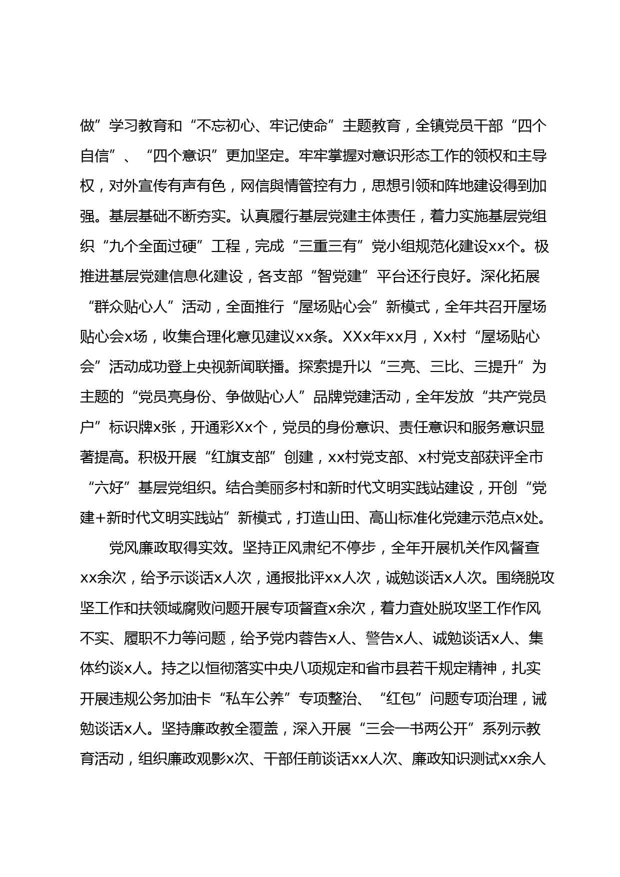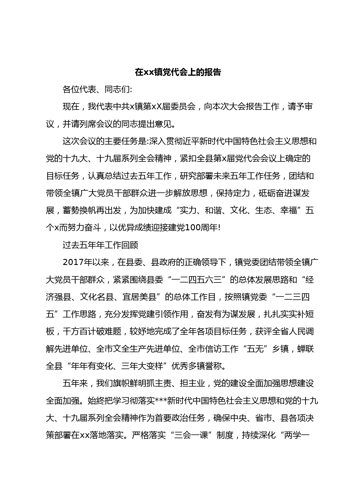在xx鎮(zhèn)黨代會(huì)上的報(bào)告各位代表、同志們:現(xiàn)在,我代表中共x鎮(zhèn)第xX屆委員會(huì),向本次大會(huì)報(bào)告工作,請(qǐng)予審議,并請(qǐng)列席會(huì)議的同志提出意見。這次會(huì)議的主要任務(wù)是:深入貫徹近平新時(shí)代中國特色社會(huì)主義思想和黨的十九大、十九屆系列全會(huì)精神,緊扣全縣第x屆黨代會(huì)會(huì)議上確定的目標(biāo)任務(wù),認(rèn)真總結(jié)過去五年工作,研究部署未來五年工作任務(wù),團(tuán)結(jié)和帶領(lǐng)全鎮(zhèn)廣大黨員干部群眾進(jìn)一步解放思想,保持定力,砥礪奮進(jìn)謀發(fā)展,蓄勢(shì)換帆再出發(fā),為加快建成“實(shí)力、和諧、文化、生態(tài)、幸福”五個(gè)x而努力奮斗,以優(yōu)異成績迎接建黨100周年!過去五年年工作回顧2017年以來,在縣委、縣政府的...
