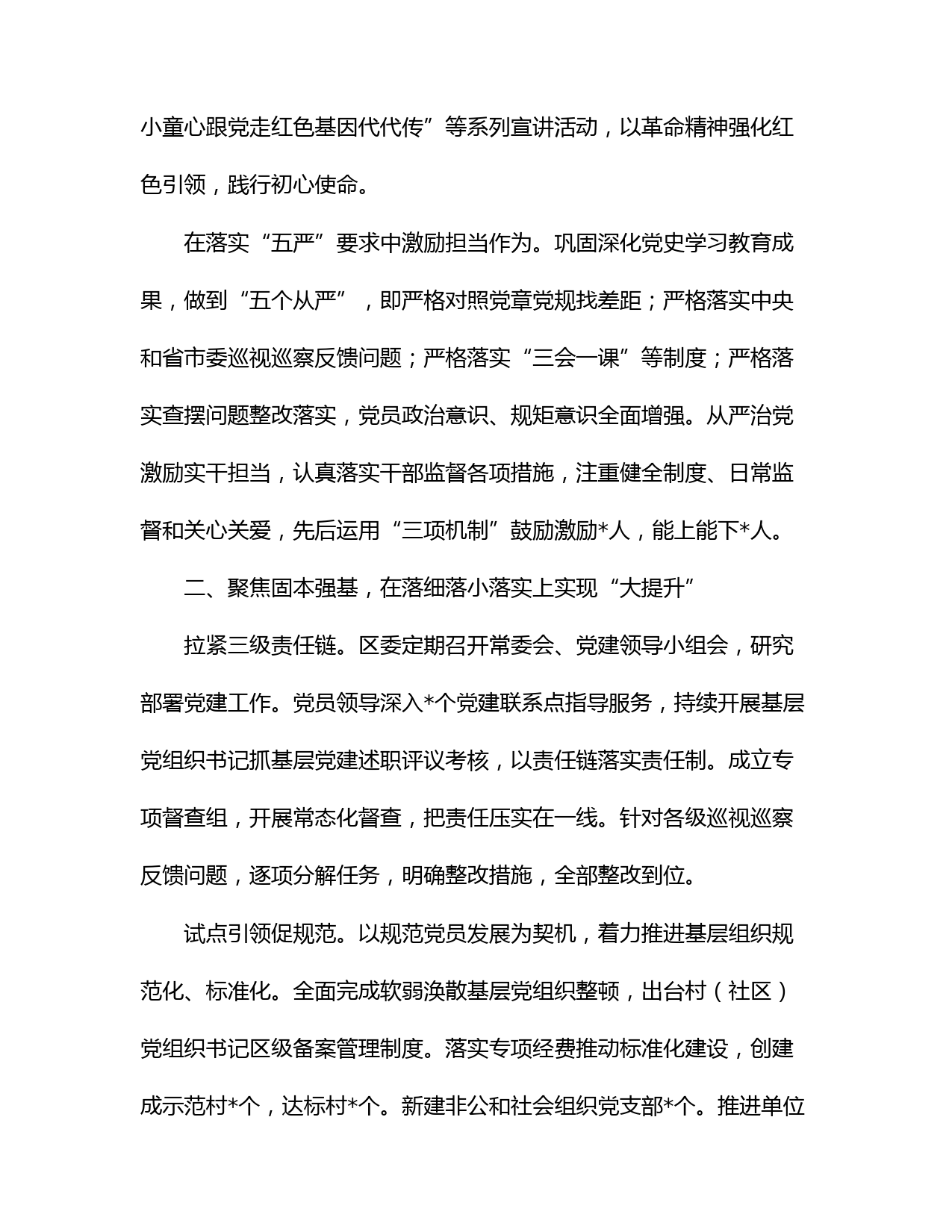 某區(qū)基層黨建工作經(jīng)驗(yàn)發(fā)言材料2022年,在市委組織部的精心指導(dǎo)下,區(qū)始終堅(jiān)持以黨的政治建設(shè)為統(tǒng)領(lǐng),深入踐行黨的組織路線,緊扣黨建引領(lǐng)高質(zhì)量發(fā)展目標(biāo),堅(jiān)守初心使命,服務(wù)發(fā)展大局,求實(shí)尚新,砥礪前行,基層黨建工作全面提升。一、傳承紅色基因,在堅(jiān)守初心使命中接受“大淬煉”在厚植理論根基中強(qiáng)化政治建設(shè)。把學(xué)習(xí)貫徹習(xí)近平新時代中國特色社會主義思想作為首要任務(wù),推動習(xí)近平總書記來陜考察重要講話重要指示精神落地生根。扎實(shí)推進(jìn)黨史學(xué)習(xí)教育常態(tài)化制度化,堅(jiān)持學(xué)思用貫通、知信行合一。區(qū)委中心組“夜間黨校”集中學(xué)習(xí)39次,黨委班子在舉辦5天專題讀書班,...