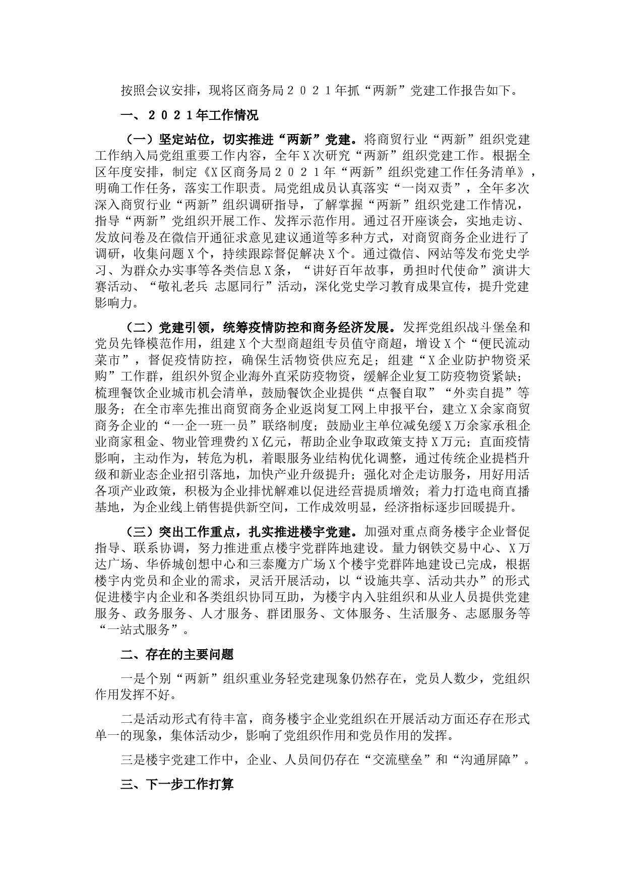 按照會(huì)議安排,現(xiàn)將區(qū)商務(wù)局2021年抓“兩新”黨建工作報(bào)告如下。一、2021年工作情況(一)堅(jiān)定站位,切實(shí)推進(jìn)“兩新”黨建。將商貿(mào)行業(yè)“兩新”組織黨建工作納入局黨組重要工作內(nèi)容,全年X次研究“兩新”組織黨建工作。根據(jù)全區(qū)年度安排,制定《X區(qū)商務(wù)局2021年“兩新”組織黨建工作任務(wù)清單》,明確工作任務(wù),落實(shí)工作職責(zé)。局黨組成員認(rèn)真落實(shí)“一崗雙責(zé)”,全年多次深入商貿(mào)行業(yè)“兩新”組織調(diào)研指導(dǎo),了解掌握“兩新”組織黨建工作情況,指導(dǎo)“兩新”黨組織開(kāi)展工作、發(fā)揮示范作用。通過(guò)召開(kāi)座談會(huì),實(shí)地走訪、發(fā)放問(wèn)卷及在微信開(kāi)通征求意見(jiàn)建議通道等多...