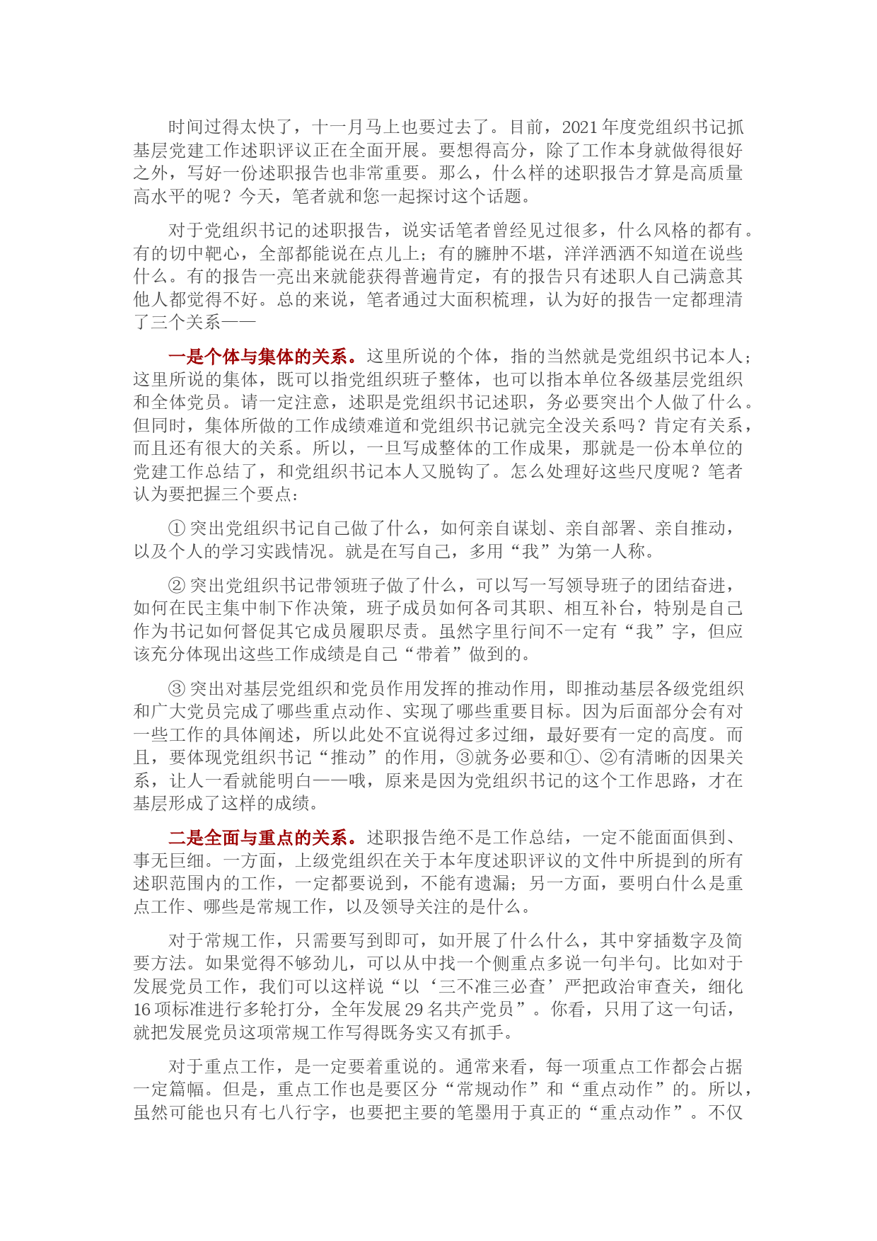 時間過得太快了,十一月馬上也要過去了。目前,2021年度黨組織書記抓基層黨建工作述職評議正在全面開展。要想得高分,除了工作本身就做得很好之外,寫好一份述職報告也非常重要。那么,什么樣的述職報告才算是高質量高水平的呢?今天,筆者就和您一起探討這個話題。對于黨組織書記的述職報告,說實話筆者曾經(jīng)見過很多,什么風格的都有。有的切中靶心,全部都能說在點兒上;有的臃腫不堪,洋洋灑灑不知道在說些什么。有的報告一亮出來就能獲得普遍肯定,有的報告只有述職人自己滿意其他人都覺得不好??偟膩碚f,筆者通過大面積梳理,認為好的報告一定都理清了三個關系——...