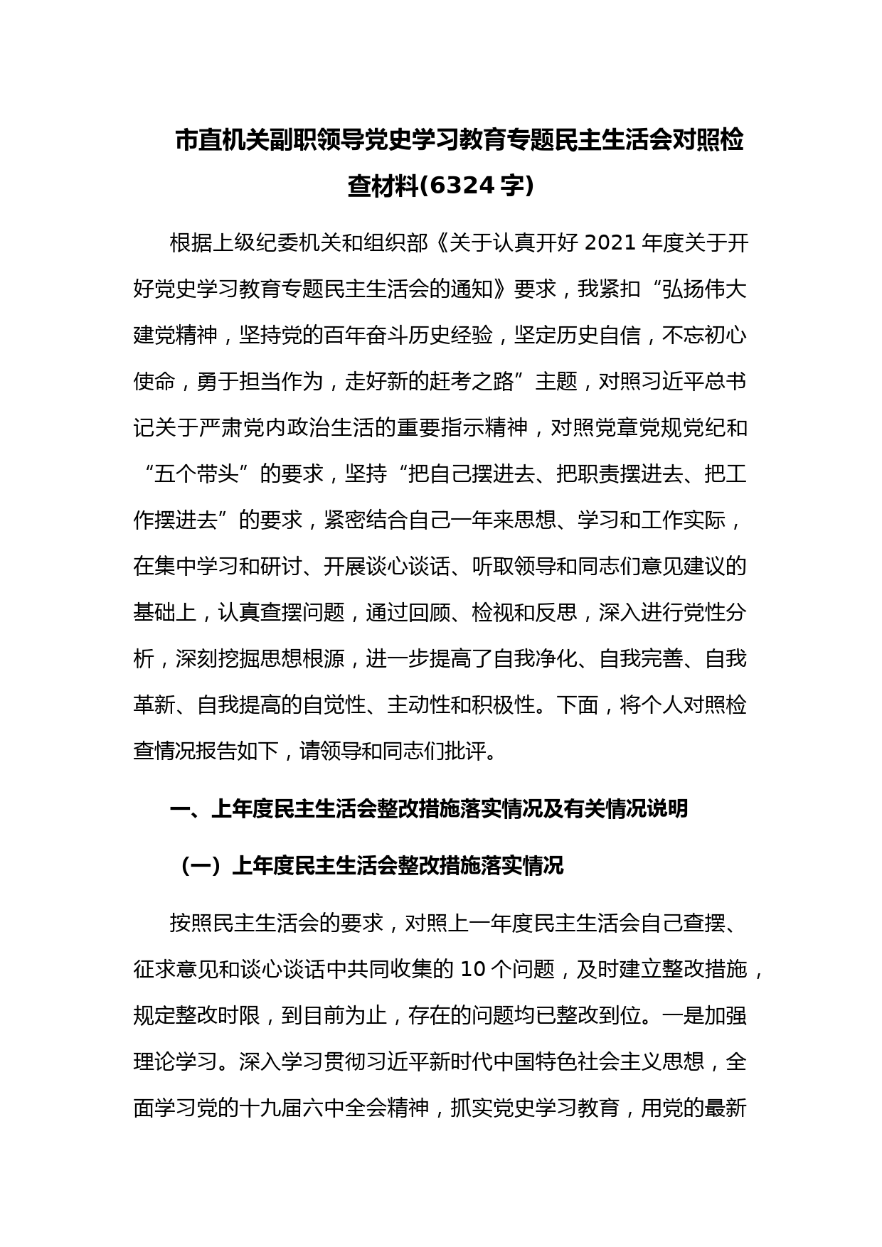 市直機(jī)關(guān)副職領(lǐng)導(dǎo)黨史學(xué)習(xí)教育專題民主生活會對照檢查材料(6324字)根據(jù)上級紀(jì)委機(jī)關(guān)和組織部《關(guān)于認(rèn)真開好2021年度關(guān)于開好黨史學(xué)習(xí)教育專題民主生活會的通知》要求,我緊扣“弘揚(yáng)偉大建黨精神,堅(jiān)持黨的百年奮斗歷史經(jīng)驗(yàn),堅(jiān)定歷史自信,不忘初心使命,勇于擔(dān)當(dāng)作為,走好新的趕考之路”主題,對照習(xí)近平總書記關(guān)于嚴(yán)肅黨內(nèi)政治生活的重要指示精神,對照黨章黨規(guī)黨紀(jì)和“五個(gè)帶頭”的要求,堅(jiān)持“把自己擺進(jìn)去、把職責(zé)擺進(jìn)去、把工作擺進(jìn)去”的要求,緊密結(jié)合自己一年來思想、學(xué)習(xí)和工作實(shí)際,在集中學(xué)習(xí)和研討、開展談心談話、聽取領(lǐng)導(dǎo)和同志們意見建議的基礎(chǔ)上,認(rèn)真...