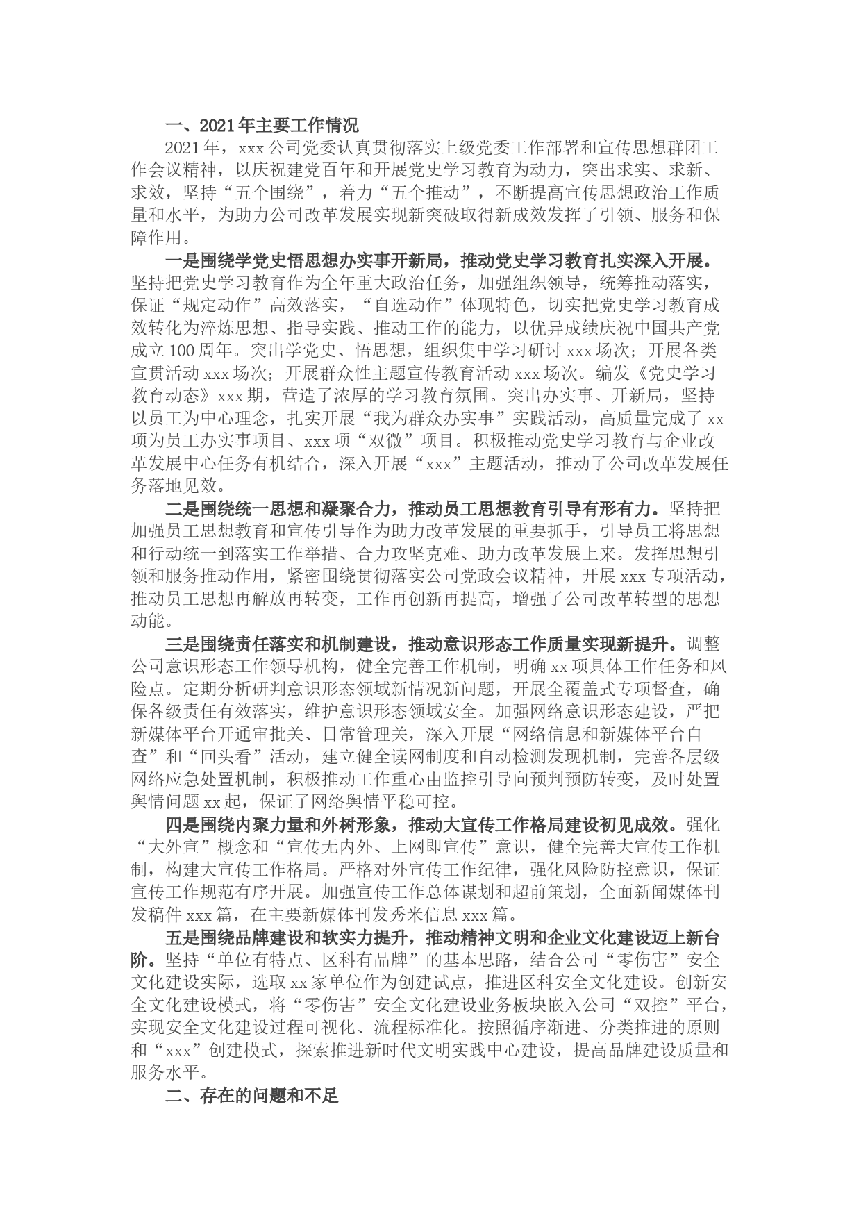 一、2021年主要工作情況2021年,xxx公司黨委認真貫徹落實上級黨委工作部署和宣傳思想群團工作會議精神,以慶祝建黨百年和開展黨史學習教育為動力,突出求實、求新、求效,堅持“五個圍繞”,著力“五個推動”,不斷提高宣傳思想政治工作質(zhì)量和水平,為助力公司改革發(fā)展實現(xiàn)新突破取得新成效發(fā)揮了引領、服務和保障作用。一是圍繞學黨史悟思想辦實事開新局,推動黨史學習教育扎實深入開展。堅持把黨史學習教育作為全年重大政治任務,加強組織領導,統(tǒng)籌推動落實,保證“規(guī)定動作”高效落實,“自選動作”體現(xiàn)特色,切實把黨史學習教育成效轉(zhuǎn)化為淬煉思想、指導實踐、推動...