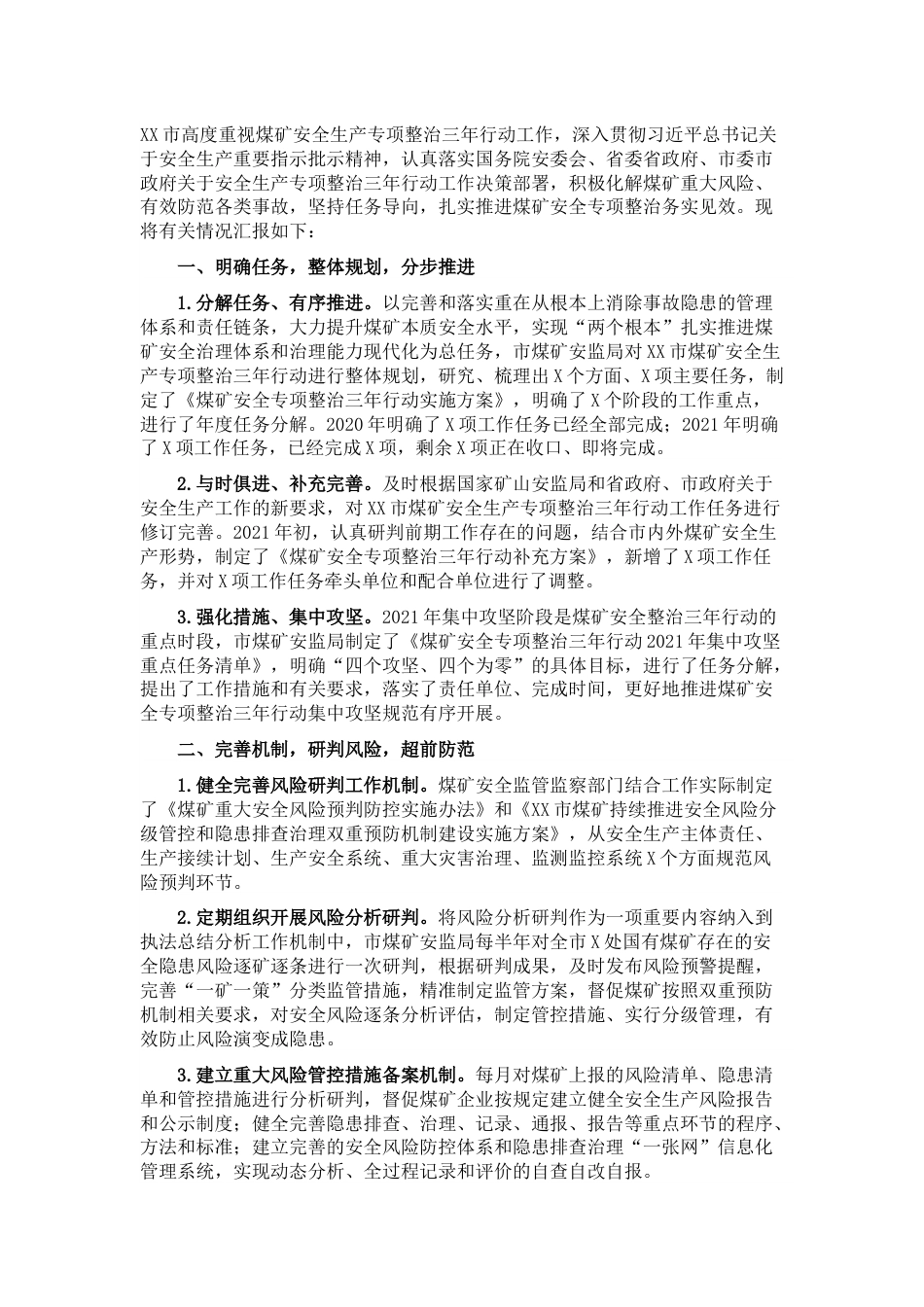XX市高度重視煤礦安全生產(chǎn)專項(xiàng)整治三年行動工作,深入貫徹習(xí)近平總書記關(guān)于安全生產(chǎn)重要指示批示精神,認(rèn)真落實(shí)國務(wù)院安委會、省委省政府、市委市政府關(guān)于安全生產(chǎn)專項(xiàng)整治三年行動工作決策部署,積極化解煤礦重大風(fēng)險、有效防范各類事故,堅持任務(wù)導(dǎo)向,扎實(shí)推進(jìn)煤礦安全專項(xiàng)整治務(wù)實(shí)見效。現(xiàn)將有關(guān)情況匯報如下:一、明確任務(wù),整體規(guī)劃,分步推進(jìn)1.分解任務(wù)、有序推進(jìn)。以完善和落實(shí)重在從根本上消除事故隱患的管理體系和責(zé)任鏈條,大力提升煤礦本質(zhì)安全水平,實(shí)現(xiàn)“兩個根本”扎實(shí)推進(jìn)煤礦安全治理體系和治理能力現(xiàn)代化為總?cè)蝿?wù),市煤礦安監(jiān)局對XX市煤礦安全生產(chǎn)專項(xiàng)...