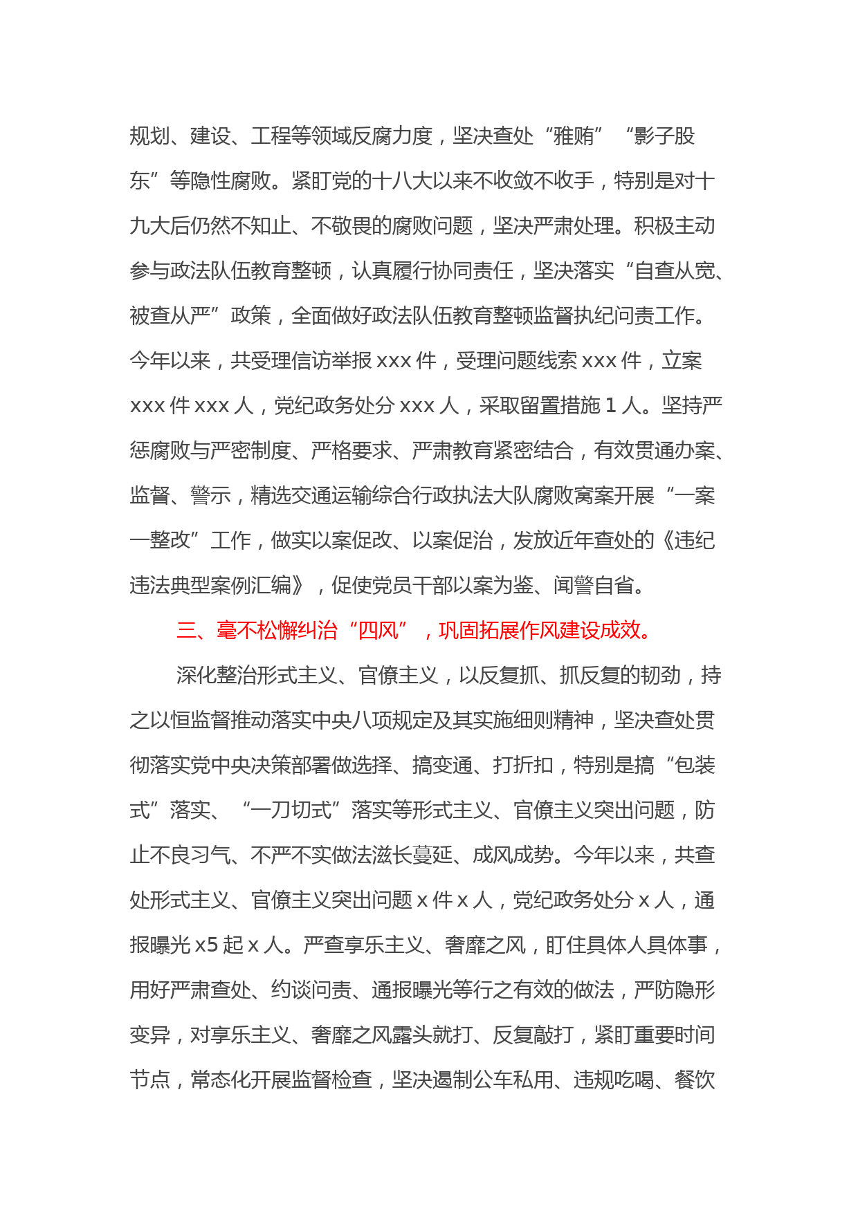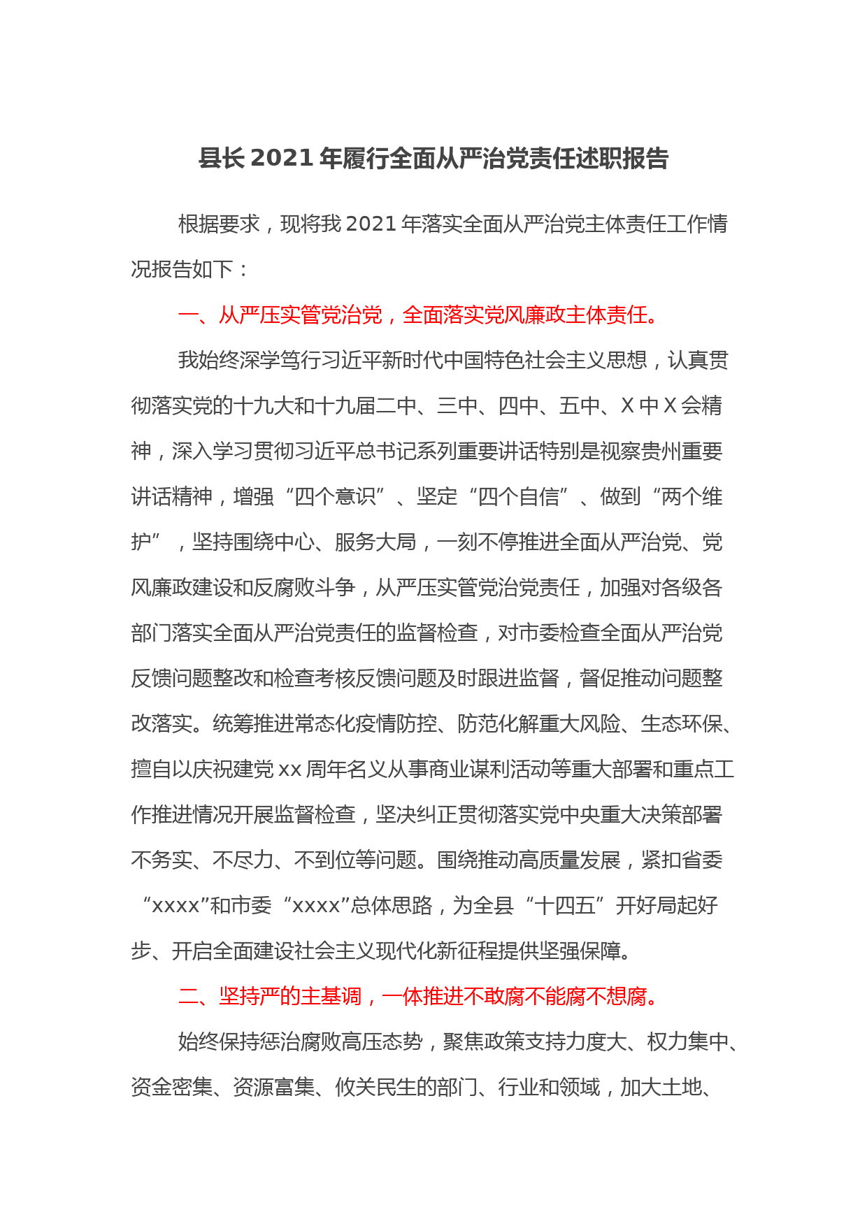 縣長2021年履行全面從嚴(yán)治黨責(zé)任述職報告根據(jù)要求,現(xiàn)將我2021年落實全面從嚴(yán)治黨主體責(zé)任工作情況報告如下:一、從嚴(yán)壓實管黨治黨,全面落實黨風(fēng)廉政主體責(zé)任。我始終深學(xué)篤行習(xí)近平新時代中國特色社會主義思想,認(rèn)真貫徹落實黨的十九大和十九屆二中、三中、四中、五中、X中X會精神,深入學(xué)習(xí)貫徹習(xí)近平總書記系列重要講話特別是視察貴州重要講話精神,增強(qiáng)“四個意識”、堅定“四個自信”、做到“兩個維護(hù)”,堅持圍繞中心、服務(wù)大局,一刻不停推進(jìn)全面從嚴(yán)治黨、黨風(fēng)廉政建設(shè)和反腐敗斗爭,從嚴(yán)壓實管黨治黨責(zé)任,加強(qiáng)對各級各部門落實全面從嚴(yán)治黨責(zé)任的監(jiān)督檢查,對...