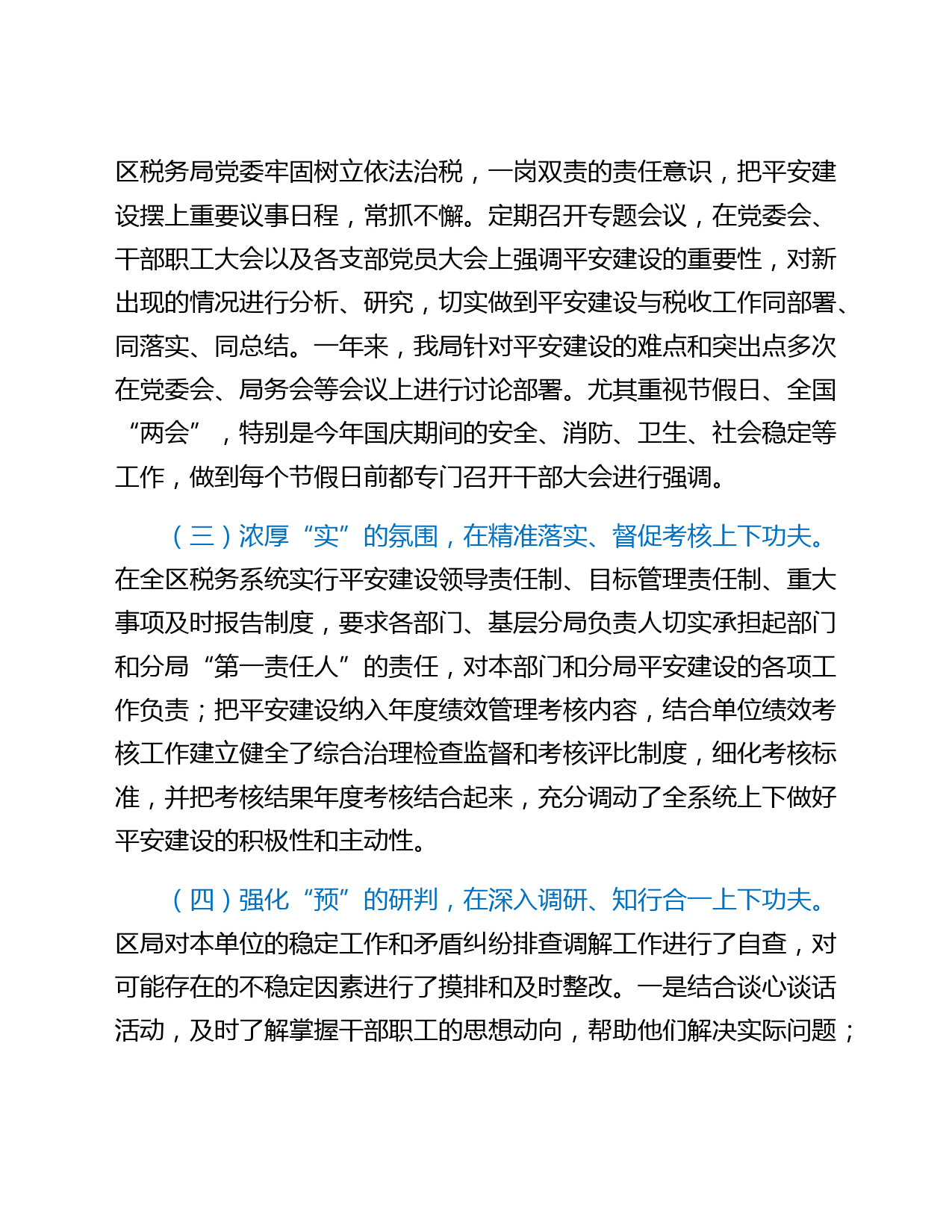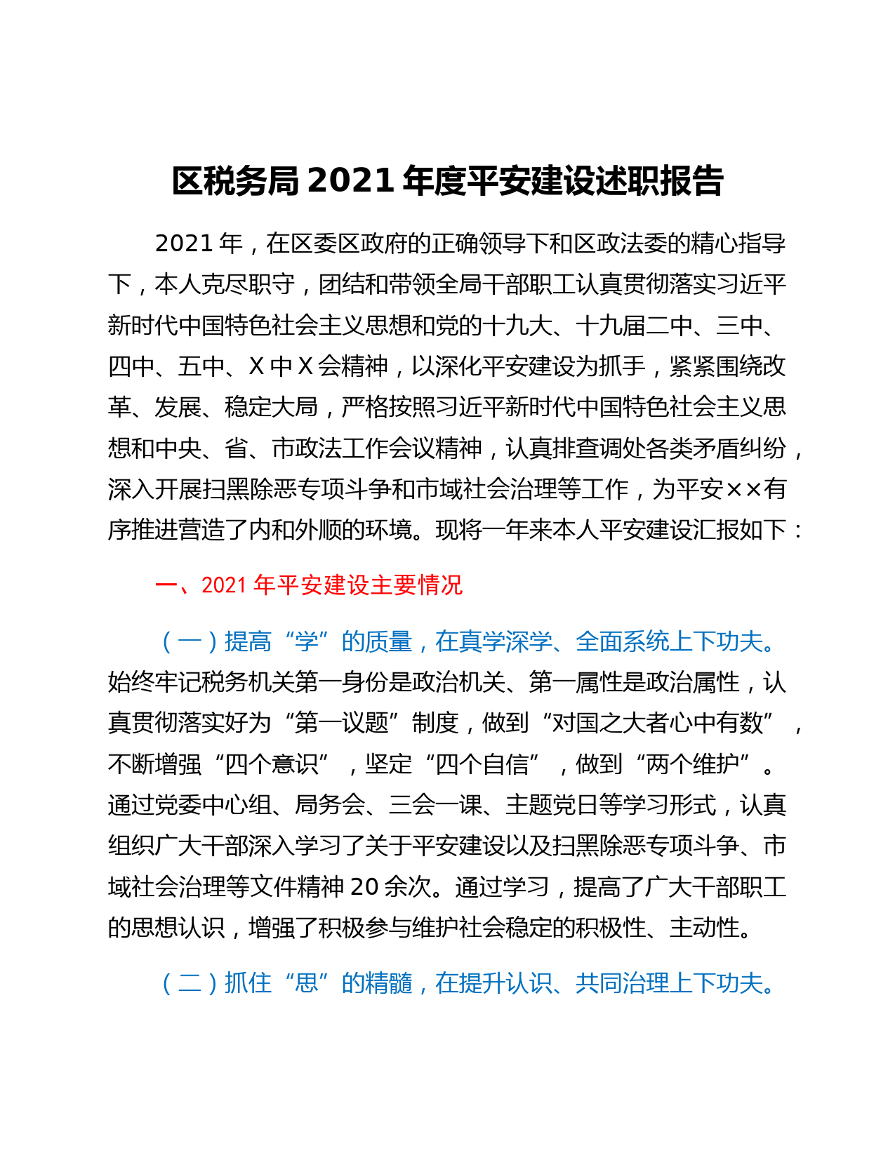 區(qū)稅務(wù)局2021年度平安建設(shè)述職報(bào)告2021年,在區(qū)委區(qū)政府的正確領(lǐng)導(dǎo)下和區(qū)政法委的精心指導(dǎo)下,本人克盡職守,團(tuán)結(jié)和帶領(lǐng)全局干部職工認(rèn)真貫徹落實(shí)習(xí)近平新時(shí)代中國(guó)特色社會(huì)主義思想和黨的十九大、十九屆二中、三中、四中、五中、X中X會(huì)精神,以深化平安建設(shè)為抓手,緊緊圍繞改革、發(fā)展、穩(wěn)定大局,嚴(yán)格按照習(xí)近平新時(shí)代中國(guó)特色社會(huì)主義思想和中央、省、市政法工作會(huì)議精神,認(rèn)真排查調(diào)處各類矛盾糾紛,深入開展掃黑除惡專項(xiàng)斗爭(zhēng)和市域社會(huì)治理等工作,為平安××有序推進(jìn)營(yíng)造了內(nèi)和外順的環(huán)境。現(xiàn)將一年來本人平安建設(shè)匯報(bào)如下:一、2021年平安建設(shè)主要情況(一)提高“...