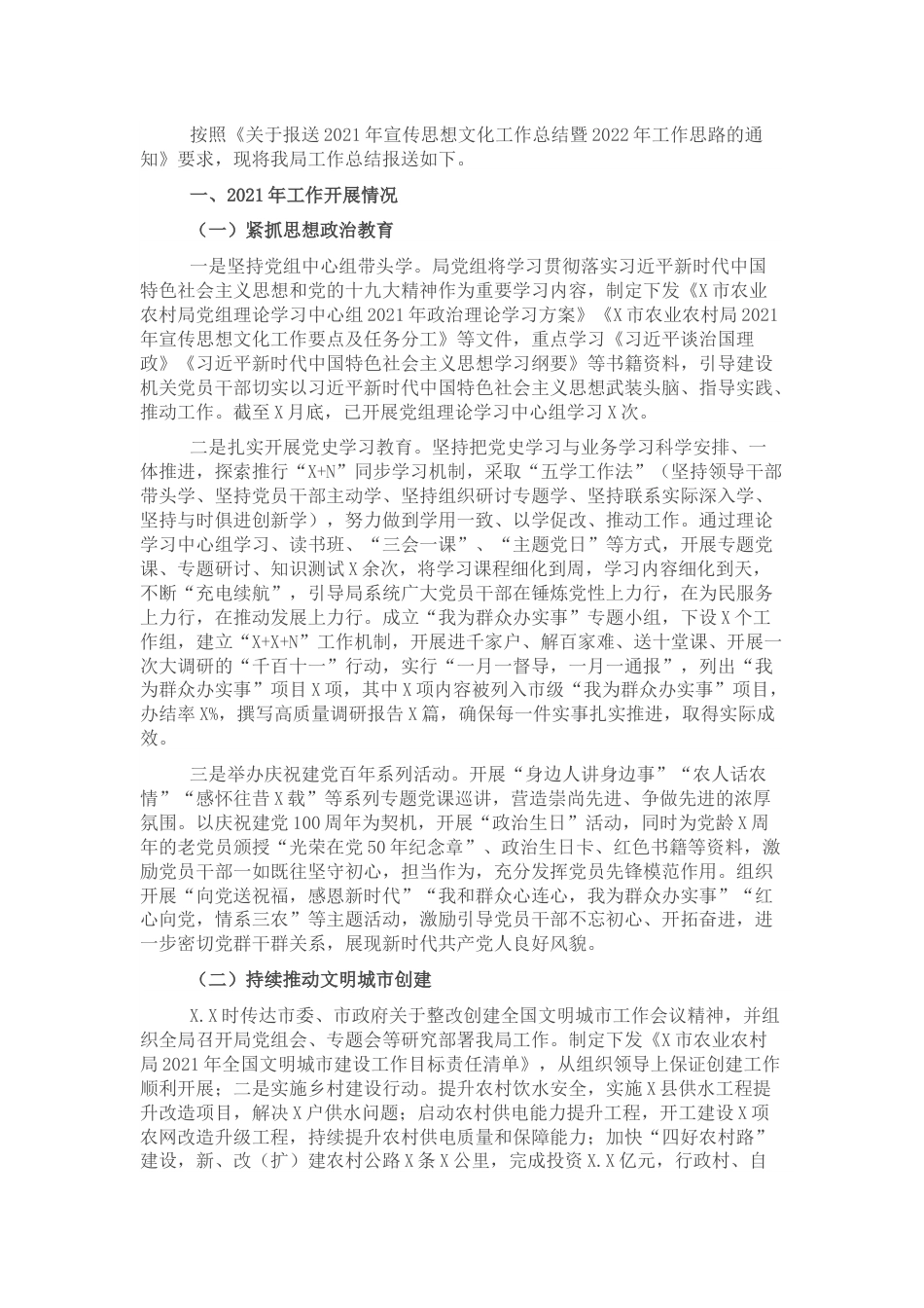 市農(nóng)業(yè)農(nóng)村局2021年宣傳思想文化工作總結(jié)暨2022年工作思路VIP免費