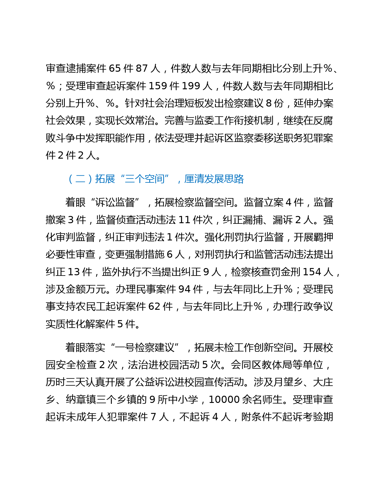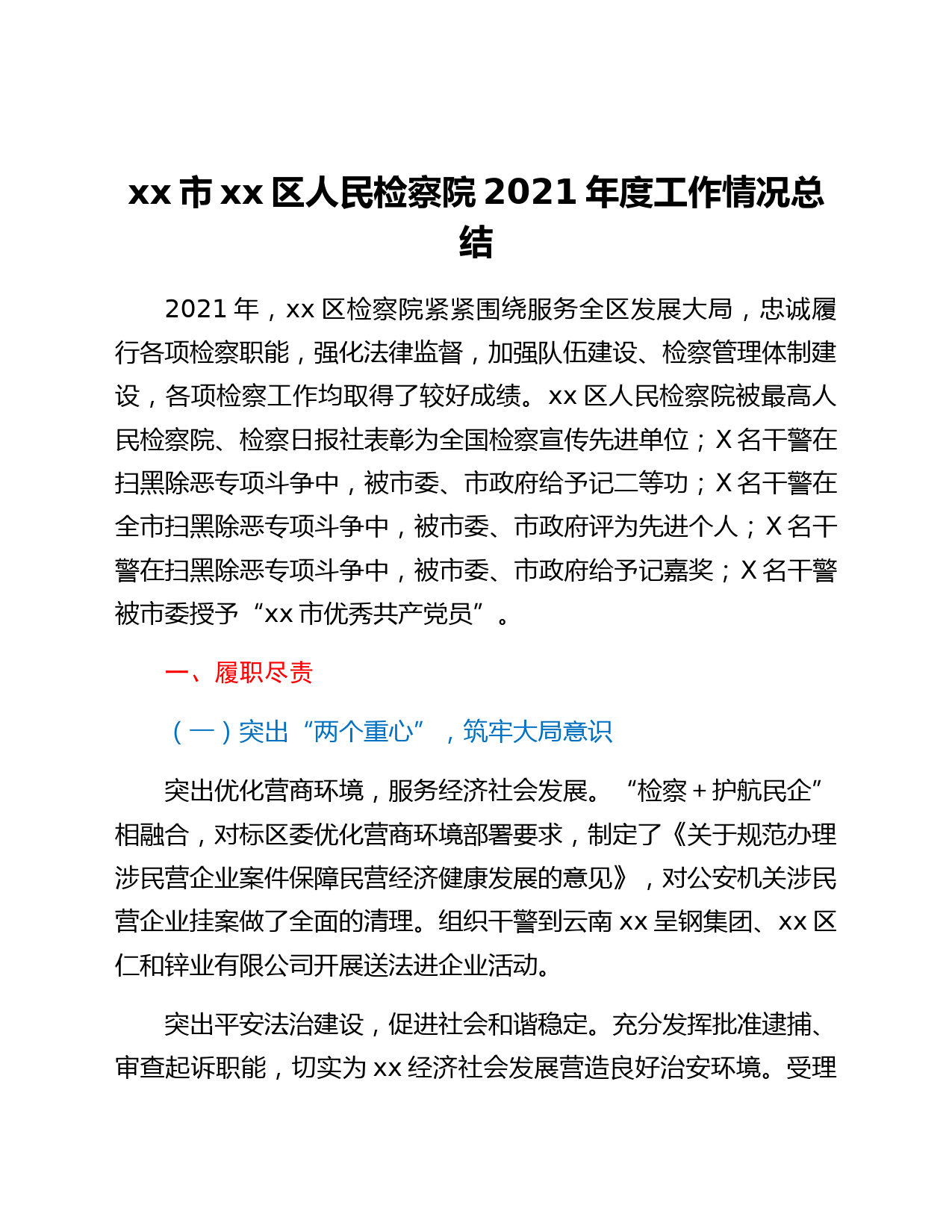xx市xx區(qū)人民檢察院2021年度工作情況總結(jié)2021年,xx區(qū)檢察院緊緊圍繞服務(wù)全區(qū)發(fā)展大局,忠誠履行各項(xiàng)檢察職能,強(qiáng)化法律監(jiān)督,加強(qiáng)隊(duì)伍建設(shè)、檢察管理體制建設(shè),各項(xiàng)檢察工作均取得了較好成績。xx區(qū)人民檢察院被最高人民檢察院、檢察日?qǐng)?bào)社表彰為全國檢察宣傳先進(jìn)單位;X名干警在掃黑除惡專項(xiàng)斗爭中,被市委、市政府給予記二等功;X名干警在全市掃黑除惡專項(xiàng)斗爭中,被市委、市政府評(píng)為先進(jìn)個(gè)人;X名干警在掃黑除惡專項(xiàng)斗爭中,被市委、市政府給予記嘉獎(jiǎng);X名干警被市委授予“xx市優(yōu)秀共產(chǎn)黨員”。一、履職盡責(zé)(一)突出“兩個(gè)重心”,筑牢大局意識(shí)突出優(yōu)化營商環(huán)境,服...