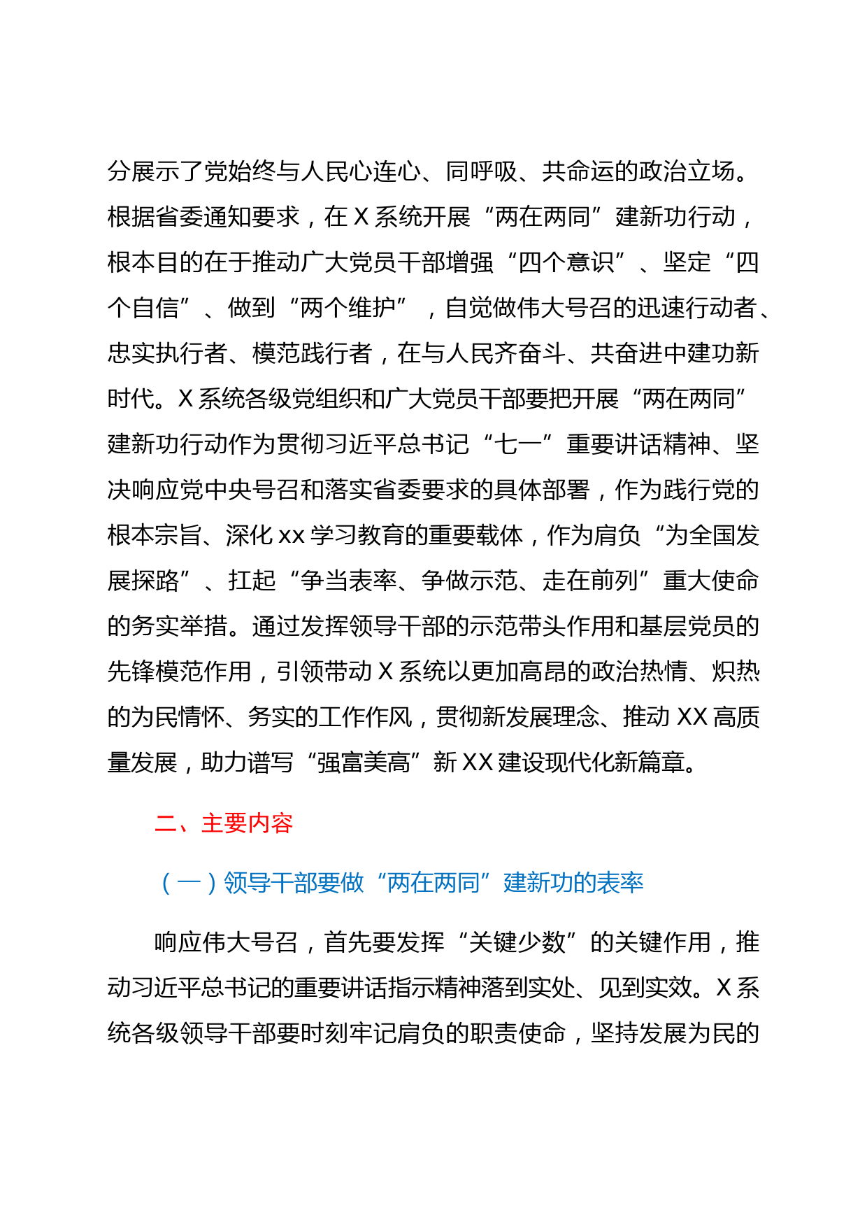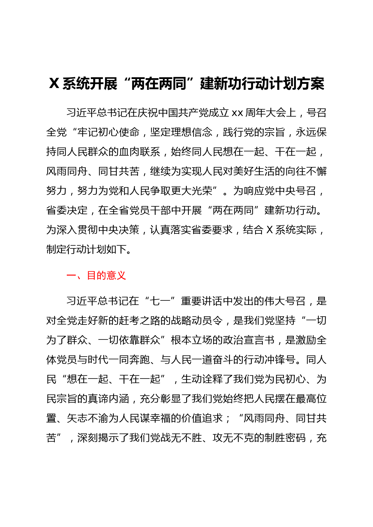 X系統(tǒng)開展“兩在兩同”建新功行動計(jì)劃方案習(xí)近平總書記在慶祝中國共產(chǎn)黨成立xx周年大會上,號召全黨“牢記初心使命,堅(jiān)定理想信念,踐行黨的宗旨,永遠(yuǎn)保持同人民群眾的血肉聯(lián)系,始終同人民想在一起、干在一起,風(fēng)雨同舟、同甘共苦,繼續(xù)為實(shí)現(xiàn)人民對美好生活的向往不懈努力,努力為黨和人民爭取更大光榮”。為響應(yīng)黨中央號召,省委決定,在全省黨員干部中開展“兩在兩同”建新功行動。為深入貫徹中央決策,認(rèn)真落實(shí)省委要求,結(jié)合X系統(tǒng)實(shí)際,制定行動計(jì)劃如下。一、目的意義習(xí)近平總書記在“七一”重要講話中發(fā)出的偉大號召,是對全黨走好新的趕考之路的戰(zhàn)略動員令,是...