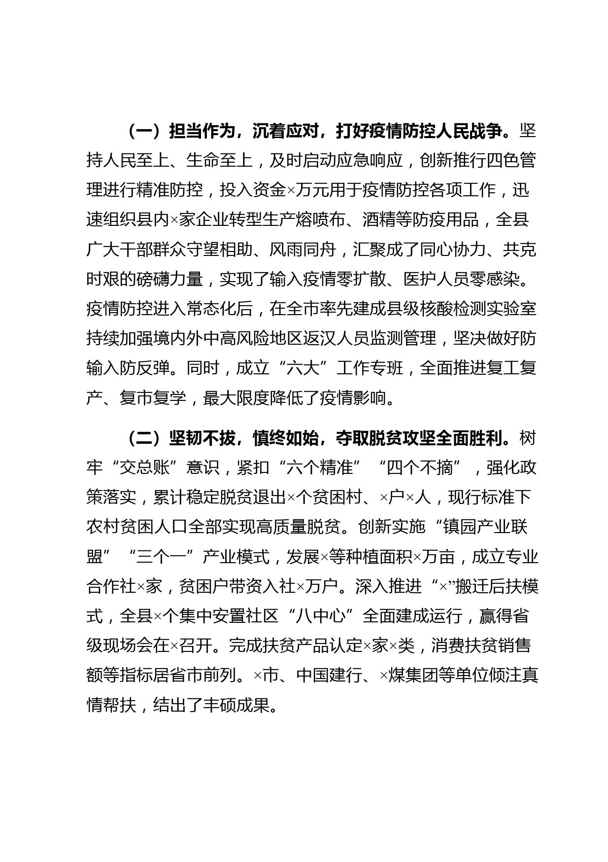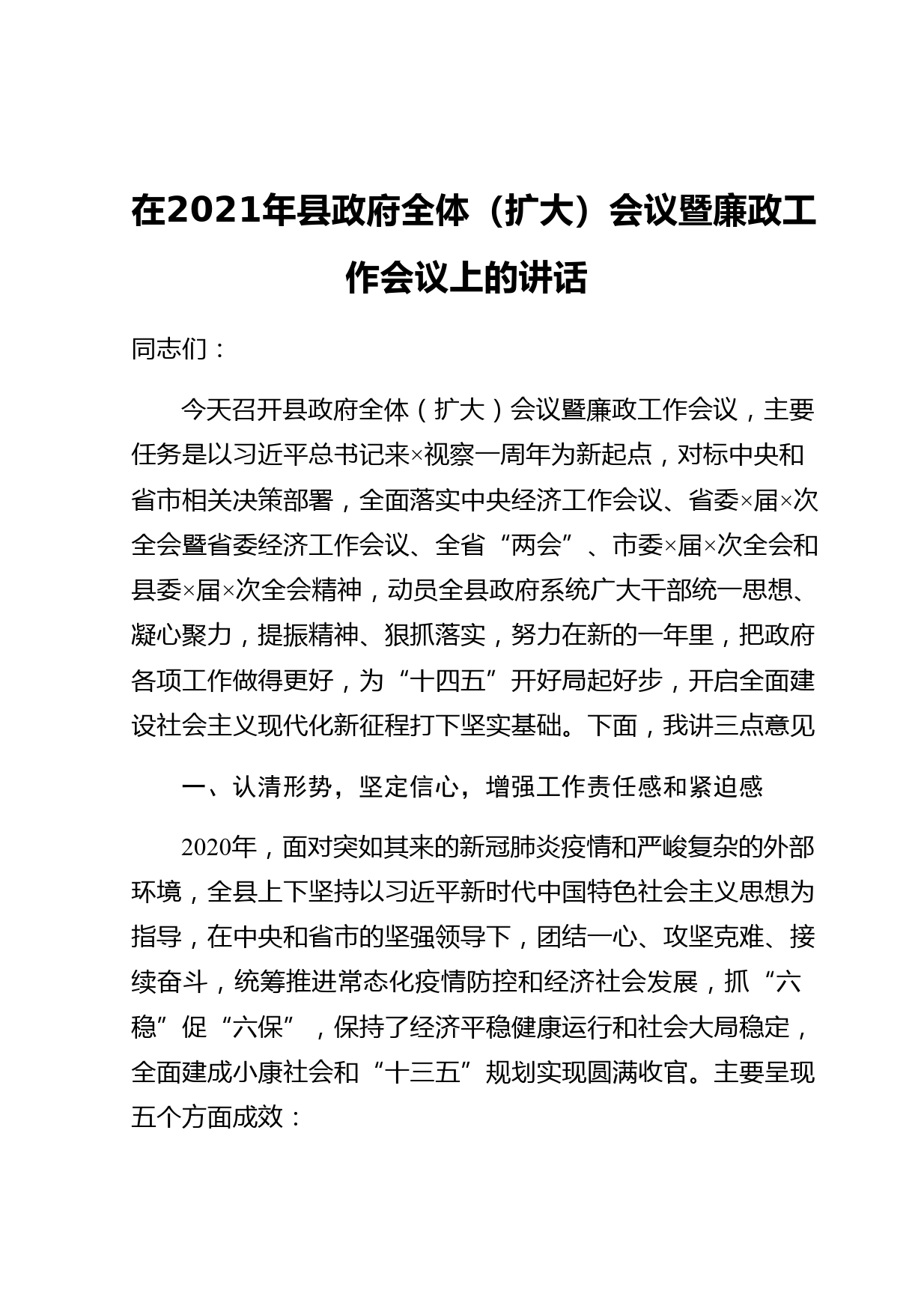 在2021年縣政府全體(擴大)會議暨廉政工作會議上的講話同志們:今天召開縣政府全體(擴大)會議暨廉政工作會議,主要任務(wù)是以習(xí)近平總書記來×視察一周年為新起點,對標(biāo)中央和省市相關(guān)決策部署,全面落實中央經(jīng)濟工作會議、省委×屆×次全會暨省委經(jīng)濟工作會議、全省“兩會”、市委×屆×次全會和縣委×屆×次全會精神,動員全縣政府系統(tǒng)廣大干部統(tǒng)一思想、凝心聚力,提振精神、狠抓落實,努力在新的一年里,把政府各項工作做得更好,為“十四五”開好局起好步,開啟全面建設(shè)社會主義現(xiàn)代化新征程打下堅實基礎(chǔ)。下面,我講三點意見一、認(rèn)清形勢,堅定信心,增強工作責(zé)任...