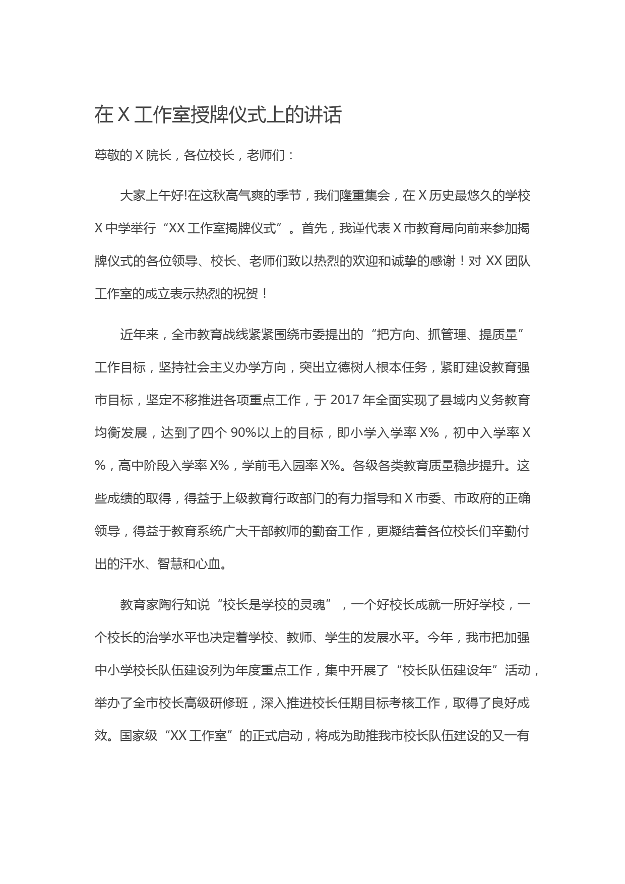在X工作室授牌儀式上的講話(huà)尊敬的X院長(zhǎng),各位校長(zhǎng),老師們:大家上午好!在這秋高氣爽的季節(jié),我們隆重集會(huì),在X歷史最悠久的學(xué)校X中學(xué)舉行“XX工作室揭牌儀式”。首先,我謹(jǐn)代表X市教育局向前來(lái)參加揭牌儀式的各位領(lǐng)導(dǎo)、校長(zhǎng)、老師們致以熱烈的歡迎和誠(chéng)摯的感謝!對(duì)XX團(tuán)隊(duì)工作室的成立表示熱烈的祝賀!近年來(lái),全市教育戰(zhàn)線(xiàn)緊緊圍繞市委提出的“把方向、抓管理、提質(zhì)量”工作目標(biāo),堅(jiān)持社會(huì)主義辦學(xué)方向,突出立德樹(shù)人根本任務(wù),緊盯建設(shè)教育強(qiáng)市目標(biāo),堅(jiān)定不移推進(jìn)各項(xiàng)重點(diǎn)工作,于2017年全面實(shí)現(xiàn)了縣域內(nèi)義務(wù)教育均衡發(fā)展,達(dá)到了四個(gè)90%以上的目標(biāo),即小學(xué)入學(xué)率X%,...