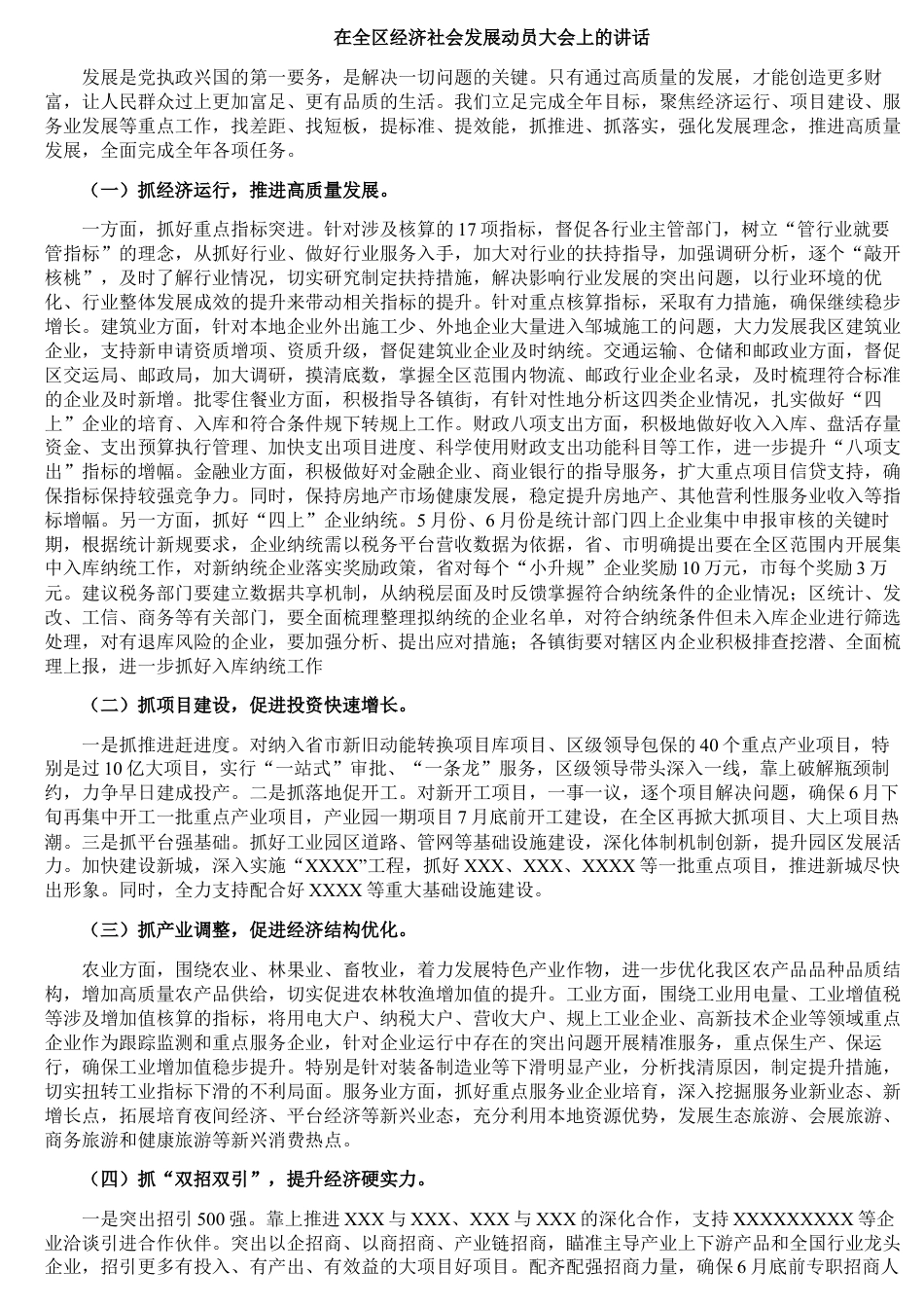 在全區(qū)經(jīng)濟(jì)社會(huì)發(fā)展動(dòng)員大會(huì)上的講話發(fā)展是黨執(zhí)政興國(guó)的第一要?jiǎng)?wù),是解決一切問題的關(guān)鍵。只有通過高質(zhì)量的發(fā)展,才能創(chuàng)造更多財(cái)富,讓人民群眾過上更加富足、更有品質(zhì)的生活。我們立足完成全年目標(biāo),聚焦經(jīng)濟(jì)運(yùn)行、項(xiàng)目建設(shè)、服務(wù)業(yè)發(fā)展等重點(diǎn)工作,找差距、找短板,提標(biāo)準(zhǔn)、提效能,抓推進(jìn)、抓落實(shí),強(qiáng)化發(fā)展理念,推進(jìn)高質(zhì)量發(fā)展,全面完成全年各項(xiàng)任務(wù)。(一)抓經(jīng)濟(jì)運(yùn)行,推進(jìn)高質(zhì)量發(fā)展。一方面,抓好重點(diǎn)指標(biāo)突進(jìn)。針對(duì)涉及核算的17項(xiàng)指標(biāo),督促各行業(yè)主管部門,樹立“管行業(yè)就要管指標(biāo)”的理念,從抓好行業(yè)、做好行業(yè)服務(wù)入手,加大對(duì)行業(yè)的扶持指導(dǎo),加強(qiáng)調(diào)研分...