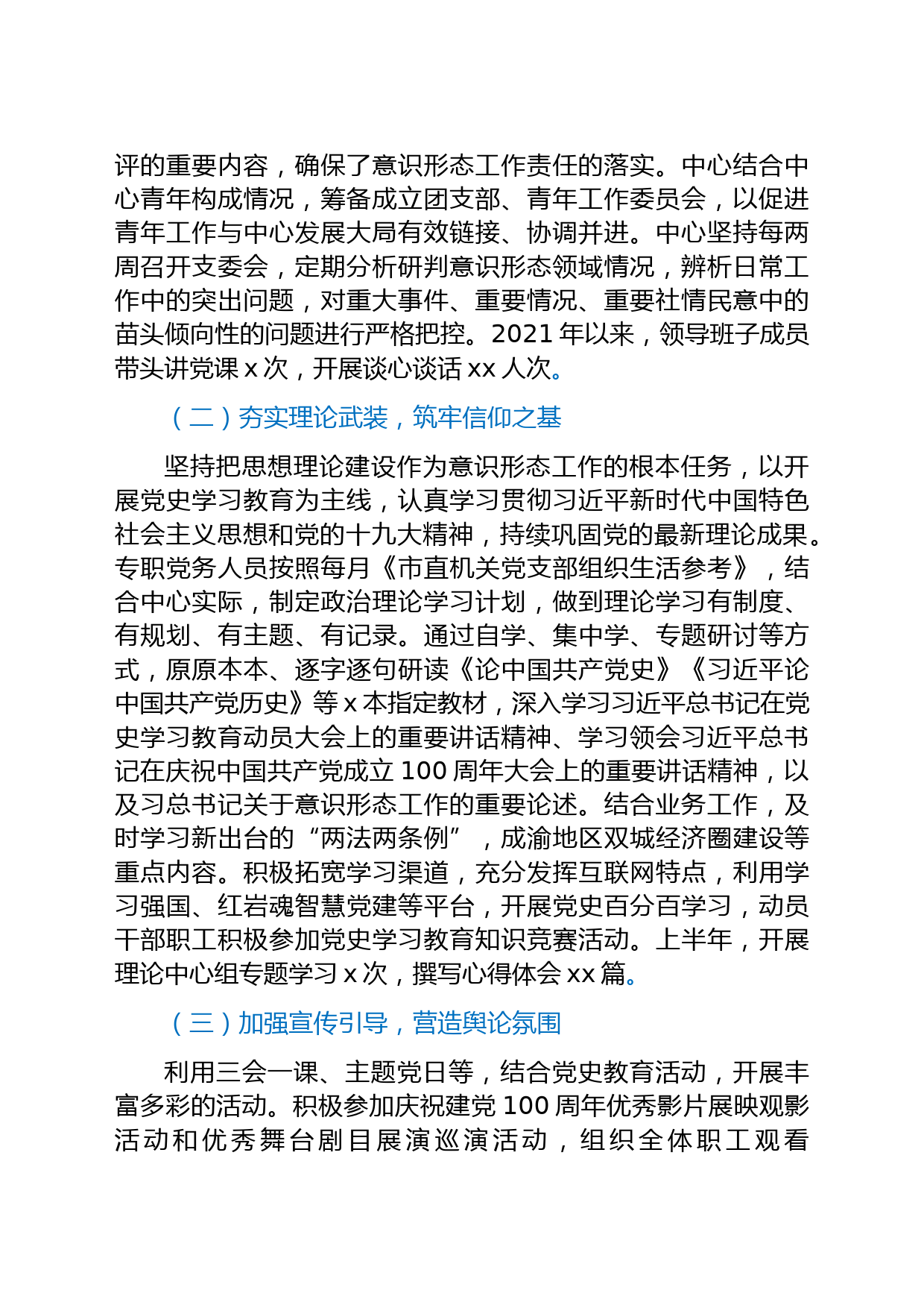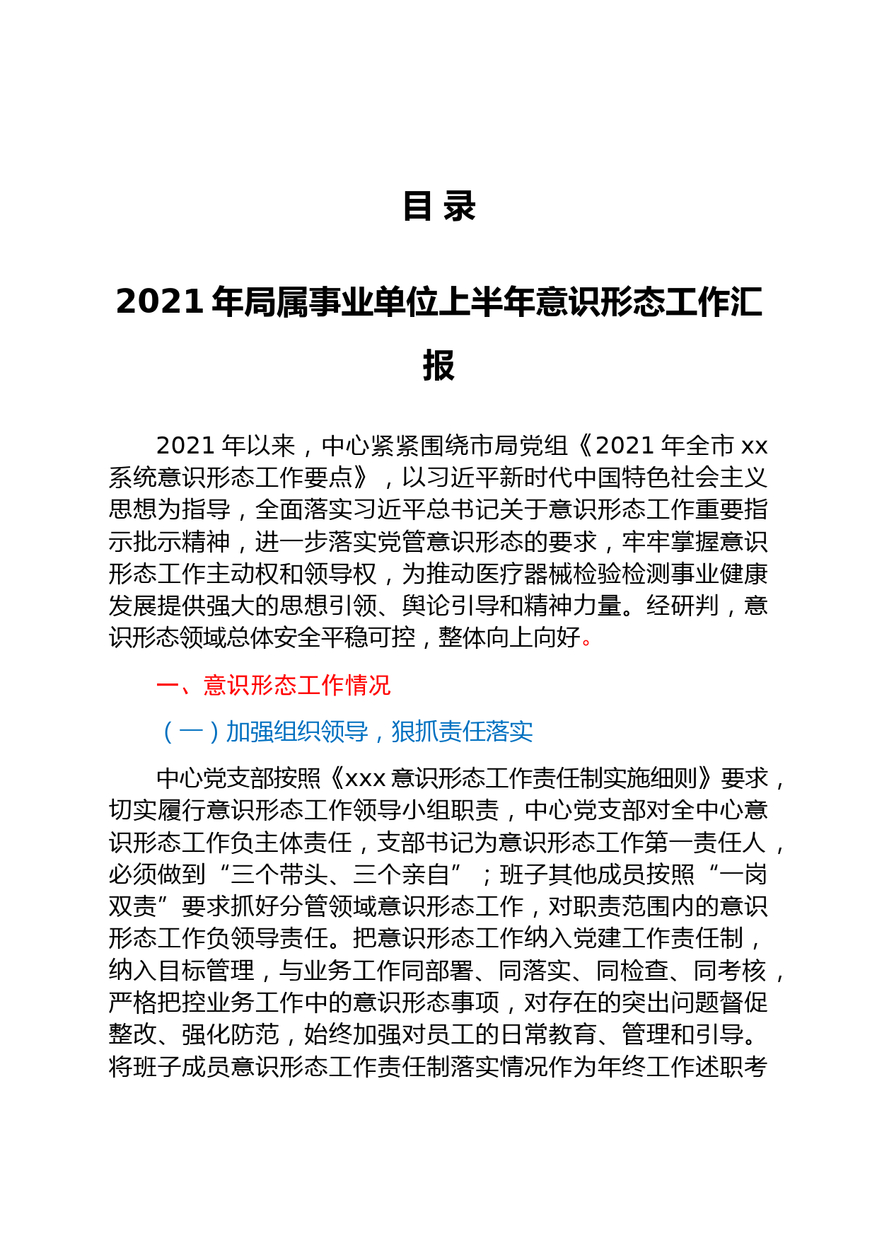 目錄2021年局屬事業(yè)單位上半年意識(shí)形態(tài)工作匯報(bào)2021年以來(lái),中心緊緊圍繞市局黨組《2021年全市xx系統(tǒng)意識(shí)形態(tài)工作要點(diǎn)》,以習(xí)近平新時(shí)代中國(guó)特色社會(huì)主義思想為指導(dǎo),全面落實(shí)習(xí)近平總書(shū)記關(guān)于意識(shí)形態(tài)工作重要指示批示精神,進(jìn)一步落實(shí)黨管意識(shí)形態(tài)的要求,牢牢掌握意識(shí)形態(tài)工作主動(dòng)權(quán)和領(lǐng)導(dǎo)權(quán),為推動(dòng)醫(yī)療器械檢驗(yàn)檢測(cè)事業(yè)健康發(fā)展提供強(qiáng)大的思想引領(lǐng)、輿論引導(dǎo)和精神力量。經(jīng)研判,意識(shí)形態(tài)領(lǐng)域總體安全平穩(wěn)可控,整體向上向好。一、意識(shí)形態(tài)工作情況(一)加強(qiáng)組織領(lǐng)導(dǎo),狠抓責(zé)任落實(shí)中心黨支部按照《xxx意識(shí)形態(tài)工作責(zé)任制實(shí)施細(xì)則》要求,切實(shí)履行意識(shí)形態(tài)工作領(lǐng)...