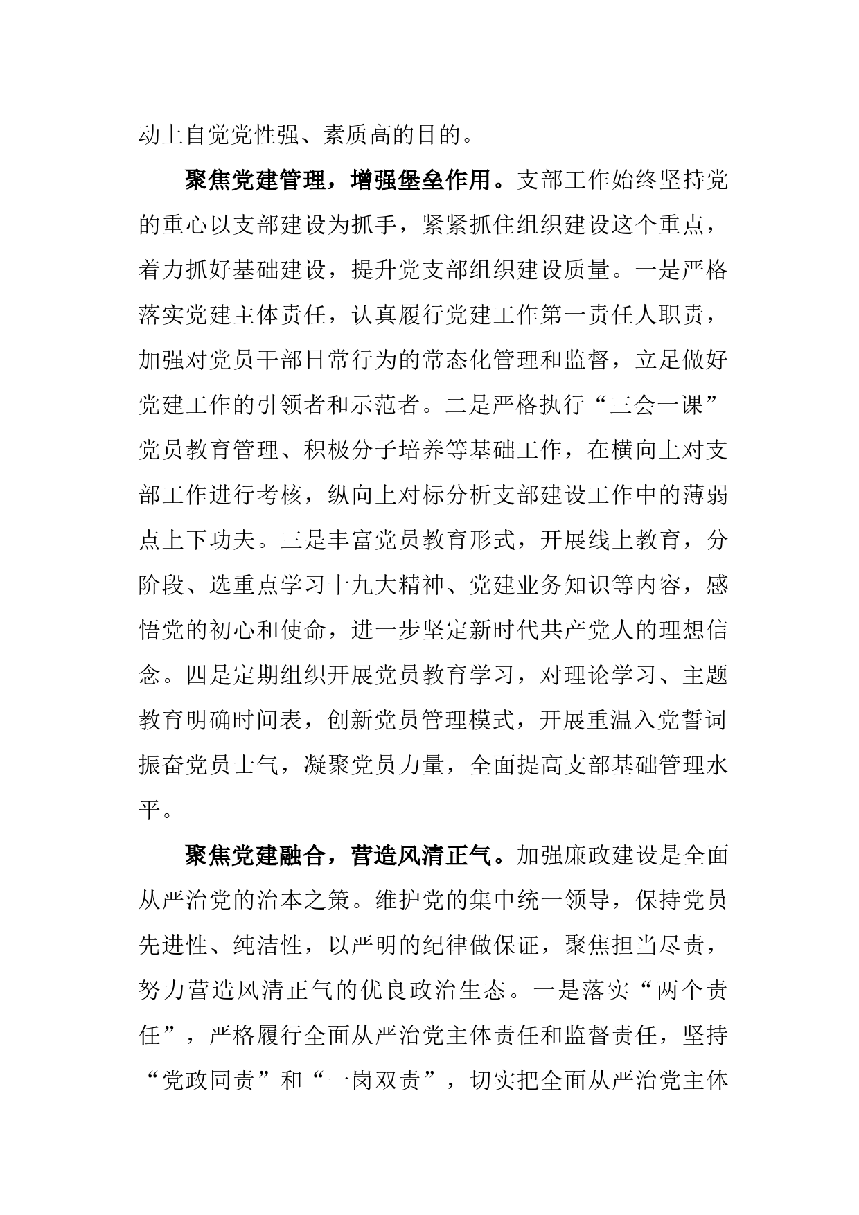 黨建工作總結(jié)經(jīng)驗(yàn)交流材料參考【范文99期】支部將“圍繞抓好黨建促發(fā)展,圍繞發(fā)展抓黨建”成為黨建工作的出發(fā)點(diǎn)和落腳點(diǎn),抓好支部建設(shè)工作,不斷探索激發(fā)黨建活力的新思路、新舉措、新辦法,有效保障黨的建設(shè)工作落地生根。聚集黨建學(xué)習(xí),狠抓思想教育。始終把政治理論學(xué)習(xí)擺在一切工作的首位,不斷加強(qiáng)學(xué)習(xí)教育,進(jìn)一步增強(qiáng)黨建工作的戰(zhàn)斗力、凝聚力和向心力,不斷強(qiáng)化學(xué)習(xí)教育,堅(jiān)定黨員干部理想信念,抓好黨員干部思想政治建設(shè)。一是加強(qiáng)理論學(xué)習(xí),學(xué)習(xí)貫徹黨的十九大精神及十九屆歷次全會(huì)精神,組織開(kāi)展研討交流,加深認(rèn)識(shí)和理解。采取集中學(xué)習(xí)和自學(xué)相結(jié)合的方式,...