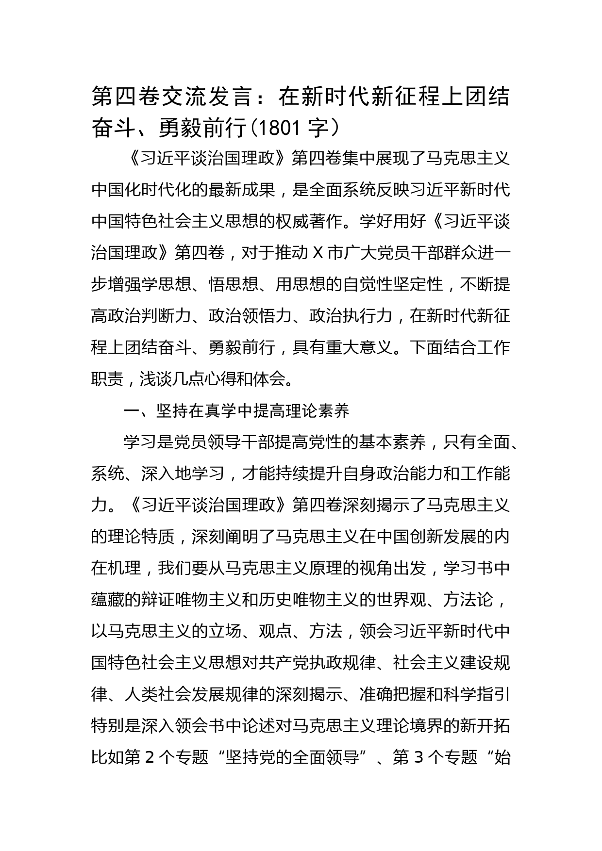 第四卷交流發(fā)言:在新時代新征程上團(tuán)結(jié)奮斗、勇毅前行(1801字)《習(xí)近平談治國理政》第四卷集中展現(xiàn)了馬克思主義中國化時代化的最新成果,是全面系統(tǒng)反映習(xí)近平新時代中國特色社會主義思想的權(quán)威著作。學(xué)好用好《習(xí)近平談治國理政》第四卷,對于推動X市廣大黨員干部群眾進(jìn)一步增強(qiáng)學(xué)思想、悟思想、用思想的自覺性堅定性,不斷提高政治判斷力、政治領(lǐng)悟力、政治執(zhí)行力,在新時代新征程上團(tuán)結(jié)奮斗、勇毅前行,具有重大意義。下面結(jié)合工作職責(zé),淺談幾點(diǎn)心得和體會。一、堅持在真學(xué)中提高理論素養(yǎng)學(xué)習(xí)是黨員領(lǐng)導(dǎo)干部提高黨性的基本素養(yǎng),只有全面、系統(tǒng)、深入地學(xué)習(xí),才能持...