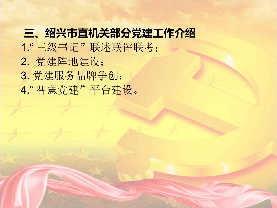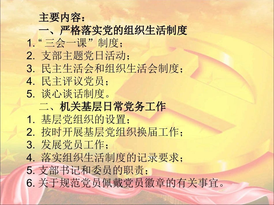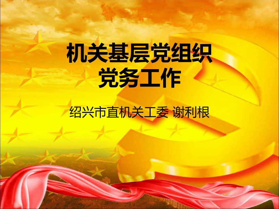 機(jī)關(guān)基層黨組織黨務(wù)工作紹興市直機(jī)關(guān)工委謝利根主要內(nèi)容:一、嚴(yán)格落實(shí)黨的組織生活制度1.“三會(huì)一課”制度;2.支部主題黨日活動(dòng);3.民主生活會(huì)和組織生活會(huì)制度;4.民主評(píng)議黨員;5.談心談話制度。二、機(jī)關(guān)基層日常黨務(wù)工作1.基層黨組織的設(shè)置;2.按時(shí)開(kāi)展基層黨組織換屆工作;3.發(fā)展黨員工作;4.落實(shí)組織生活制度的記錄要求;5.支部書(shū)記和委員的職責(zé);6.關(guān)于規(guī)范黨員佩戴黨員徽章的有關(guān)事宜。三、紹興市直機(jī)關(guān)部分黨建工作介紹1.“三級(jí)書(shū)記”聯(lián)述聯(lián)評(píng)聯(lián)考;2.黨建陣地建設(shè);3.黨建服務(wù)品牌爭(zhēng)創(chuàng);4.“智慧黨建”平臺(tái)建設(shè)。一、嚴(yán)格落實(shí)機(jī)關(guān)基層黨的組織生活制度機(jī)關(guān)基層...