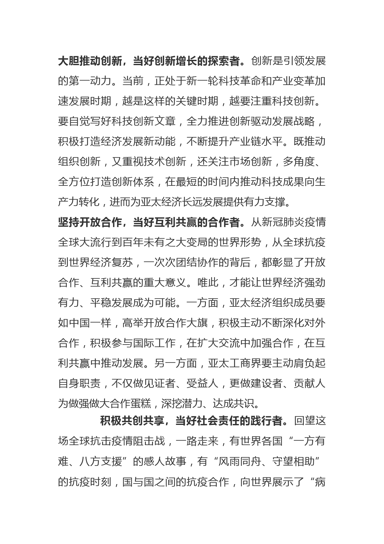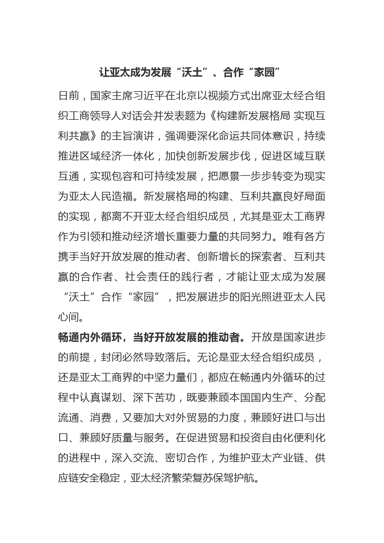 讓亞太成為發(fā)展“沃土”、合作“家園”日前,國家主席習(xí)近平在北京以視頻方式出席亞太經(jīng)合組織工商領(lǐng)導(dǎo)人對話會并發(fā)表題為《構(gòu)建新發(fā)展格局實(shí)現(xiàn)互利共贏》的主旨演講,強(qiáng)調(diào)要深化命運(yùn)共同體意識,持續(xù)推進(jìn)區(qū)域經(jīng)濟(jì)一體化,加快創(chuàng)新發(fā)展步伐,促進(jìn)區(qū)域互聯(lián)互通,實(shí)現(xiàn)包容和可持續(xù)發(fā)展,把愿景一步步轉(zhuǎn)變?yōu)楝F(xiàn)實(shí)為亞太人民造福。新發(fā)展格局的構(gòu)建、互利共贏良好局面的實(shí)現(xiàn),都離不開亞太經(jīng)合組織成員,尤其是亞太工商界作為引領(lǐng)和推動經(jīng)濟(jì)增長重要力量的共同努力。唯有各方攜手當(dāng)好開放發(fā)展的推動者、創(chuàng)新增長的探索者、互利共贏的合作者、社會責(zé)任的踐行者,才能讓亞太成為...