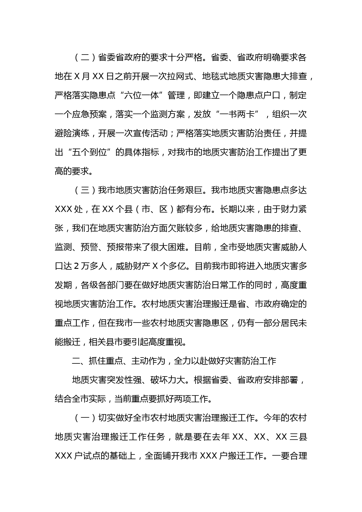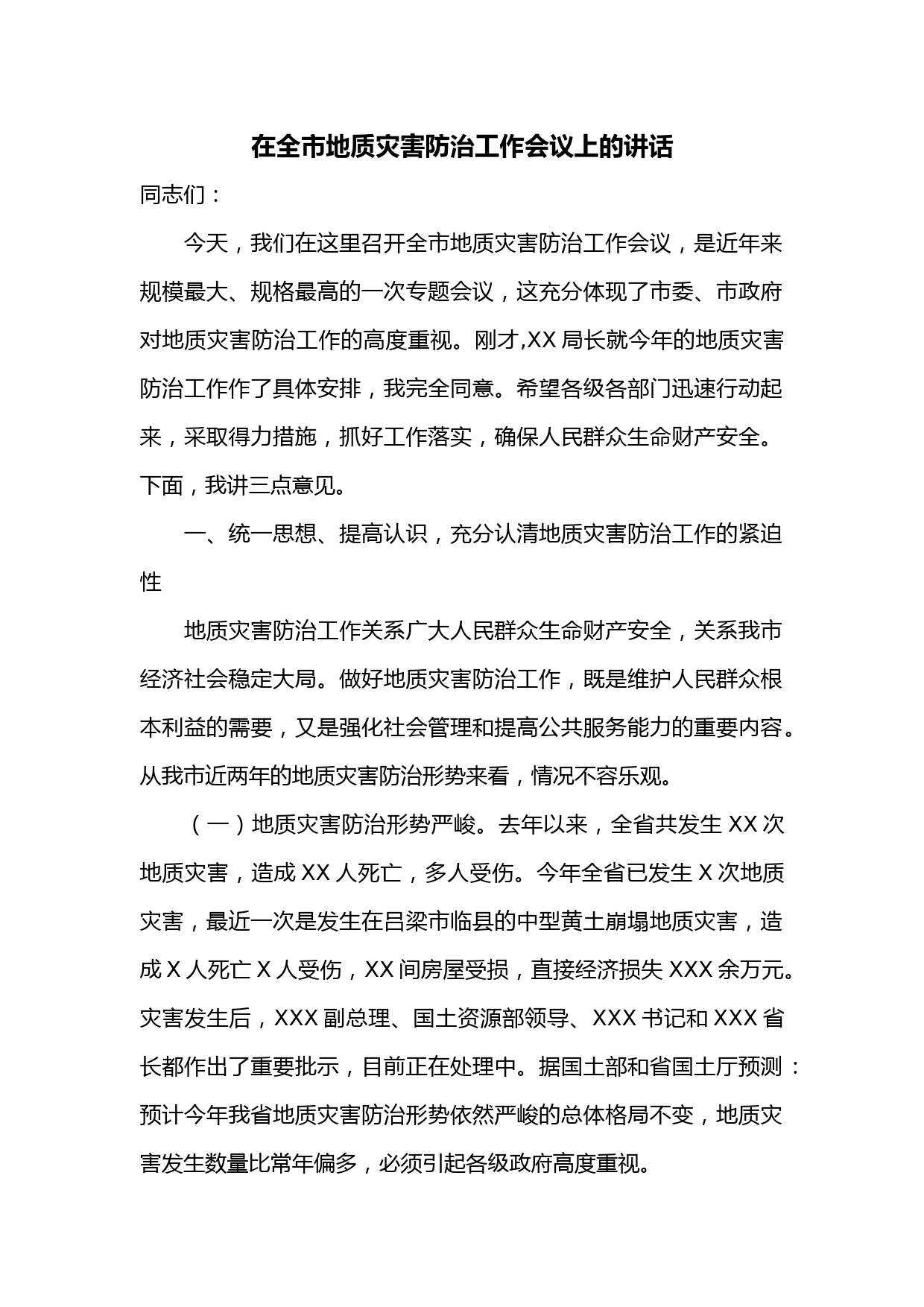 在全市地質(zhì)災(zāi)害防治工作會議上的講話同志們:今天,我們在這里召開全市地質(zhì)災(zāi)害防治工作會議,是近年來規(guī)模最大、規(guī)格最高的一次專題會議,這充分體現(xiàn)了市委、市政府對地質(zhì)災(zāi)害防治工作的高度重視。剛才,XX局長就今年的地質(zhì)災(zāi)害防治工作作了具體安排,我完全同意。希望各級各部門迅速行動起來,采取得力措施,抓好工作落實(shí),確保人民群眾生命財(cái)產(chǎn)安全。下面,我講三點(diǎn)意見。一、統(tǒng)一思想、提高認(rèn)識,充分認(rèn)清地質(zhì)災(zāi)害防治工作的緊迫性地質(zhì)災(zāi)害防治工作關(guān)系廣大人民群眾生命財(cái)產(chǎn)安全,關(guān)系我市經(jīng)濟(jì)社會穩(wěn)定大局。做好地質(zhì)災(zāi)害防治工作,既是維護(hù)人民群眾根本利益的需要,...