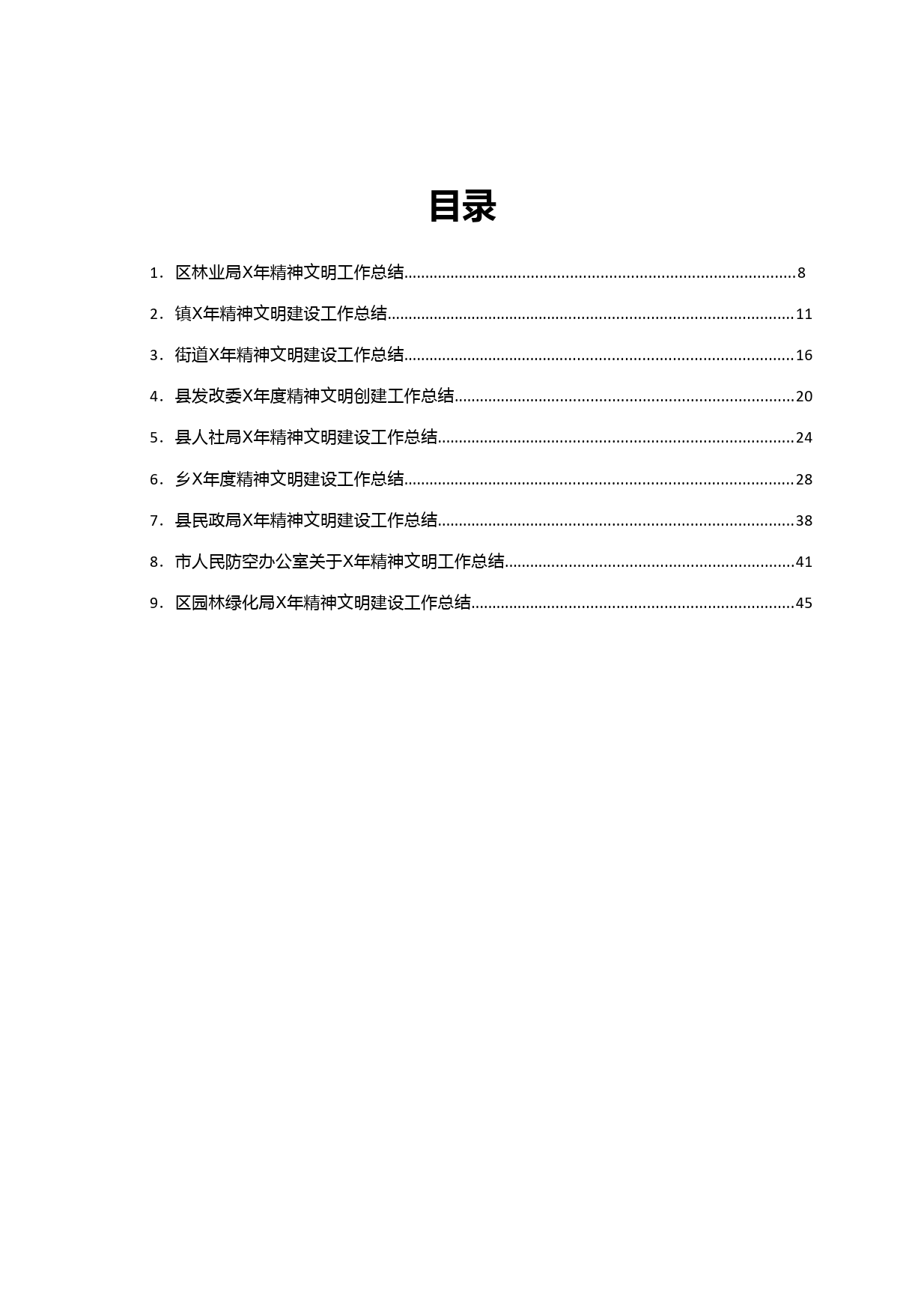 目錄1.區(qū)林業(yè)局X年精神文明工作總結(jié)...........................................................................................82.鎮(zhèn)X年精神文明建設(shè)工作總結(jié)...............................................................................................113.街道X年精神文明建設(shè)工作總結(jié)...........................................................................................164.縣發(fā)改委X年度精神文明創(chuàng)建工作總結(jié)...............................................................................205.縣人社局X年精神文明建設(shè)工作總結(jié)........