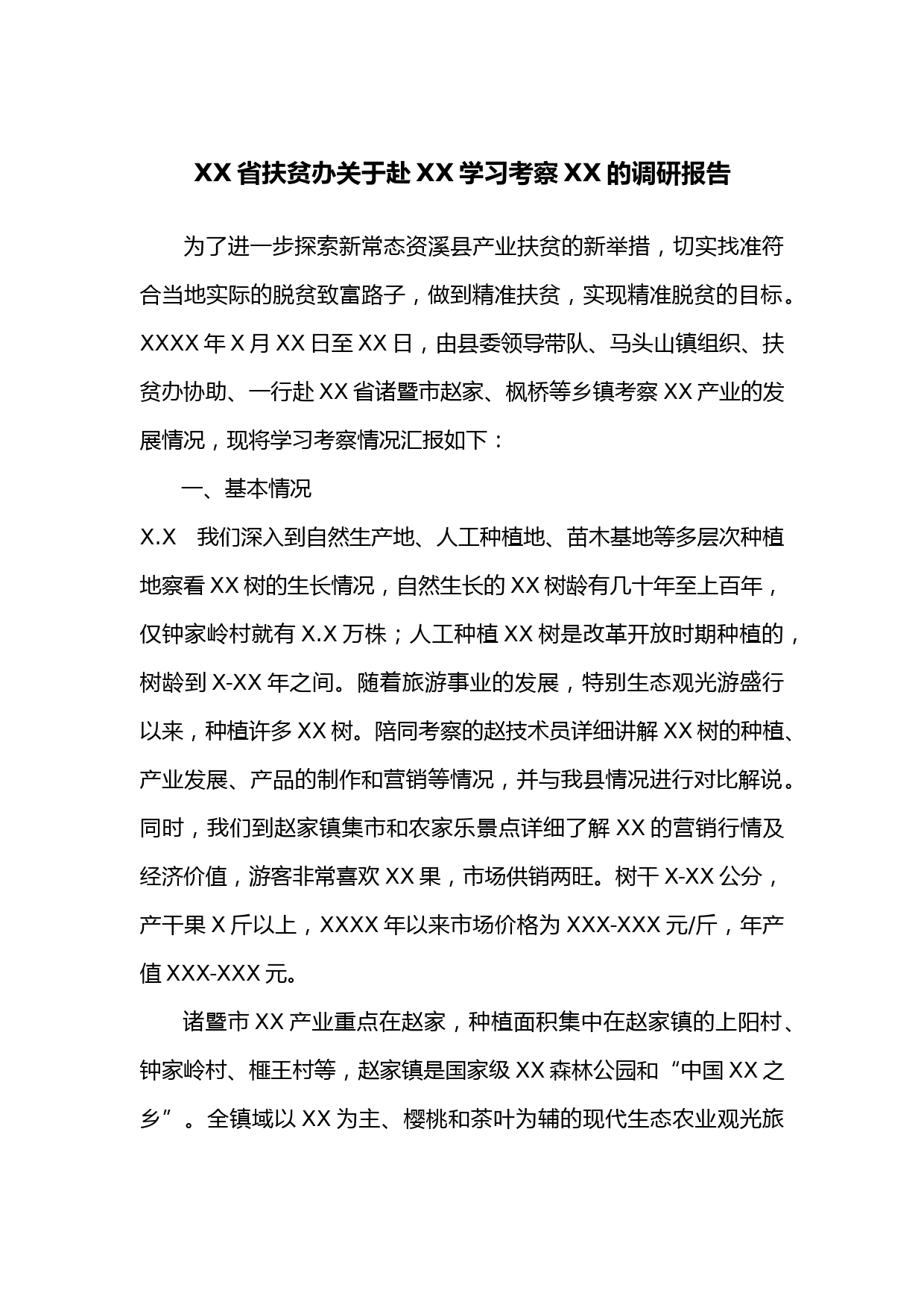 XX省扶貧辦關于赴XX學習考察XX的調研報告為了進一步探索新常態(tài)資溪縣產業(yè)扶貧的新舉措,切實找準符合當地實際的脫貧致富路子,做到精準扶貧,實現精準脫貧的目標。XXXX年X月XX日至XX日,由縣委領導帶隊、馬頭山鎮(zhèn)組織、扶貧辦協助、一行赴XX省諸暨市趙家、楓橋等鄉(xiāng)鎮(zhèn)考察XX產業(yè)的發(fā)展情況,現將學習考察情況匯報如下:一、基本情況X.X我們深入到自然生產地、人工種植地、苗木基地等多層次種植地察看XX樹的生長情況,自然生長的XX樹齡有幾十年至上百年,僅鐘家?guī)X村就有X.X萬株;人工種植XX樹是改革開放時期種植的,樹齡到X-XX年之間。隨著旅游事業(yè)的發(fā)展,特別生態(tài)觀光游...