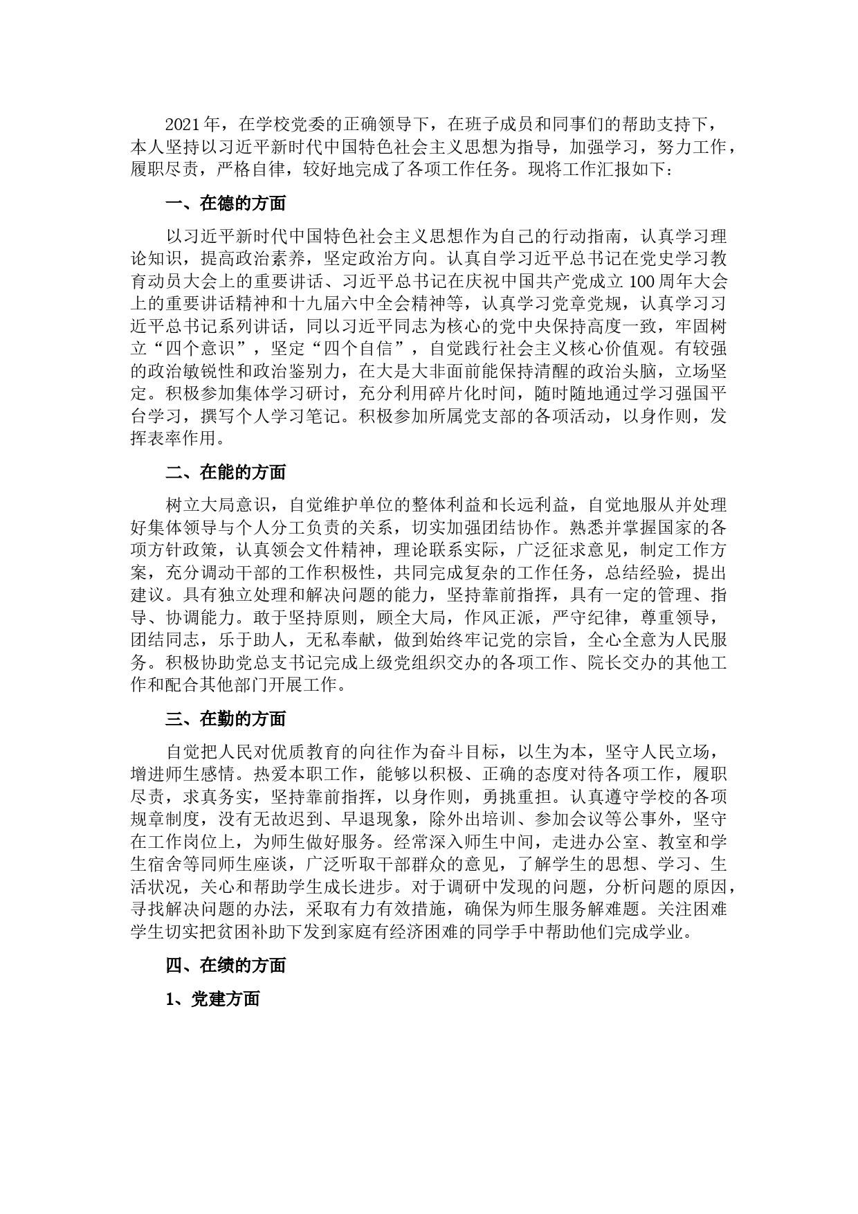 2021年,在學(xué)校黨委的正確領(lǐng)導(dǎo)下,在班子成員和同事們的幫助支持下,本人堅(jiān)持以習(xí)近平新時(shí)代中國特色社會(huì)主義思想為指導(dǎo),加強(qiáng)學(xué)習(xí),努力工作,履職盡責(zé),嚴(yán)格自律,較好地完成了各項(xiàng)工作任務(wù)?,F(xiàn)將工作匯報(bào)如下:一、在德的方面以習(xí)近平新時(shí)代中國特色社會(huì)主義思想作為自己的行動(dòng)指南,認(rèn)真學(xué)習(xí)理論知識(shí),提高政治素養(yǎng),堅(jiān)定政治方向。認(rèn)真自學(xué)習(xí)近平總書記在黨史學(xué)習(xí)教育動(dòng)員大會(huì)上的重要講話、習(xí)近平總書記在慶祝中國共產(chǎn)黨成立100周年大會(huì)上的重要講話精神和十九屆六中全會(huì)精神等,認(rèn)真學(xué)習(xí)黨章黨規(guī),認(rèn)真學(xué)習(xí)習(xí)近平總書記系列講話,同以習(xí)近平同志為核心的黨中央保...