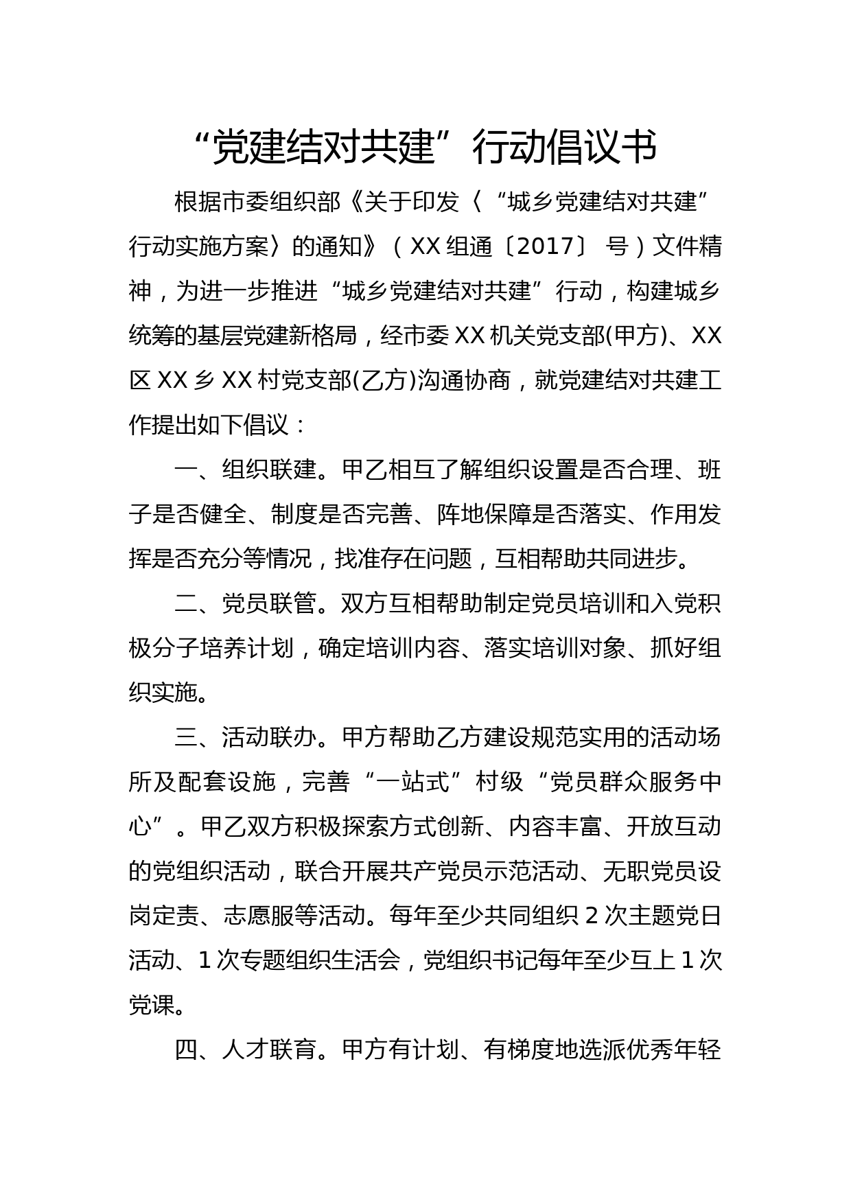 “黨建結(jié)對(duì)共建”行動(dòng)倡議書(shū)根據(jù)市委組織部《關(guān)于印發(fā)〈“城鄉(xiāng)黨建結(jié)對(duì)共建”行動(dòng)實(shí)施方案〉的通知》(XX組通〔2017〕號(hào))文件精神,為進(jìn)一步推進(jìn)“城鄉(xiāng)黨建結(jié)對(duì)共建”行動(dòng),構(gòu)建城鄉(xiāng)統(tǒng)籌的基層黨建新格局,經(jīng)市委XX機(jī)關(guān)黨支部(甲方)、XX區(qū)XX鄉(xiāng)XX村黨支部(乙方)溝通協(xié)商,就黨建結(jié)對(duì)共建工作提出如下倡議:一、組織聯(lián)建。甲乙相互了解組織設(shè)置是否合理、班子是否健全、制度是否完善、陣地保障是否落實(shí)、作用發(fā)揮是否充分等情況,找準(zhǔn)存在問(wèn)題,互相幫助共同進(jìn)步。二、黨員聯(lián)管。雙方互相幫助制定黨員培訓(xùn)和入黨積極分子培養(yǎng)計(jì)劃,確定培訓(xùn)內(nèi)容、落實(shí)培訓(xùn)對(duì)象、抓好組織實(shí)...