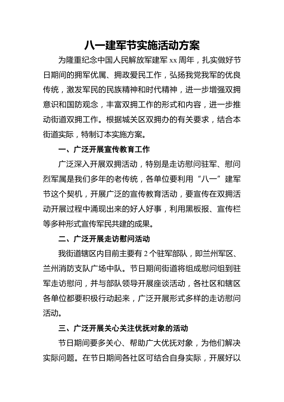 八一建軍節(jié)實施活動方案為隆重紀念中國人民解放軍建軍xx周年,扎實做好節(jié)日期間的擁軍優(yōu)屬、擁政愛民工作,弘揚我黨我軍的優(yōu)良傳統(tǒng),激發(fā)軍民的民族精神和時代精神,進一步增強雙擁意識和國防觀念,豐富雙擁工作的形式和內容,進一步推動街道雙擁工作。根據城關區(qū)雙擁辦的有關要求,結合本街道實際,特制訂本實施方案。一、廣泛開展宣傳教育工作廣泛深入開展雙擁活動,特別是走訪慰問駐軍、慰問烈軍屬是我們多年的老傳統(tǒng),各單位要利用“八一”建軍節(jié)這個契機,開展廣泛的宣傳教育活動,要宣傳在雙擁活動開展過程中涌現(xiàn)出來的好人好事,利用黑板報、宣傳欄等多種形式宣傳...