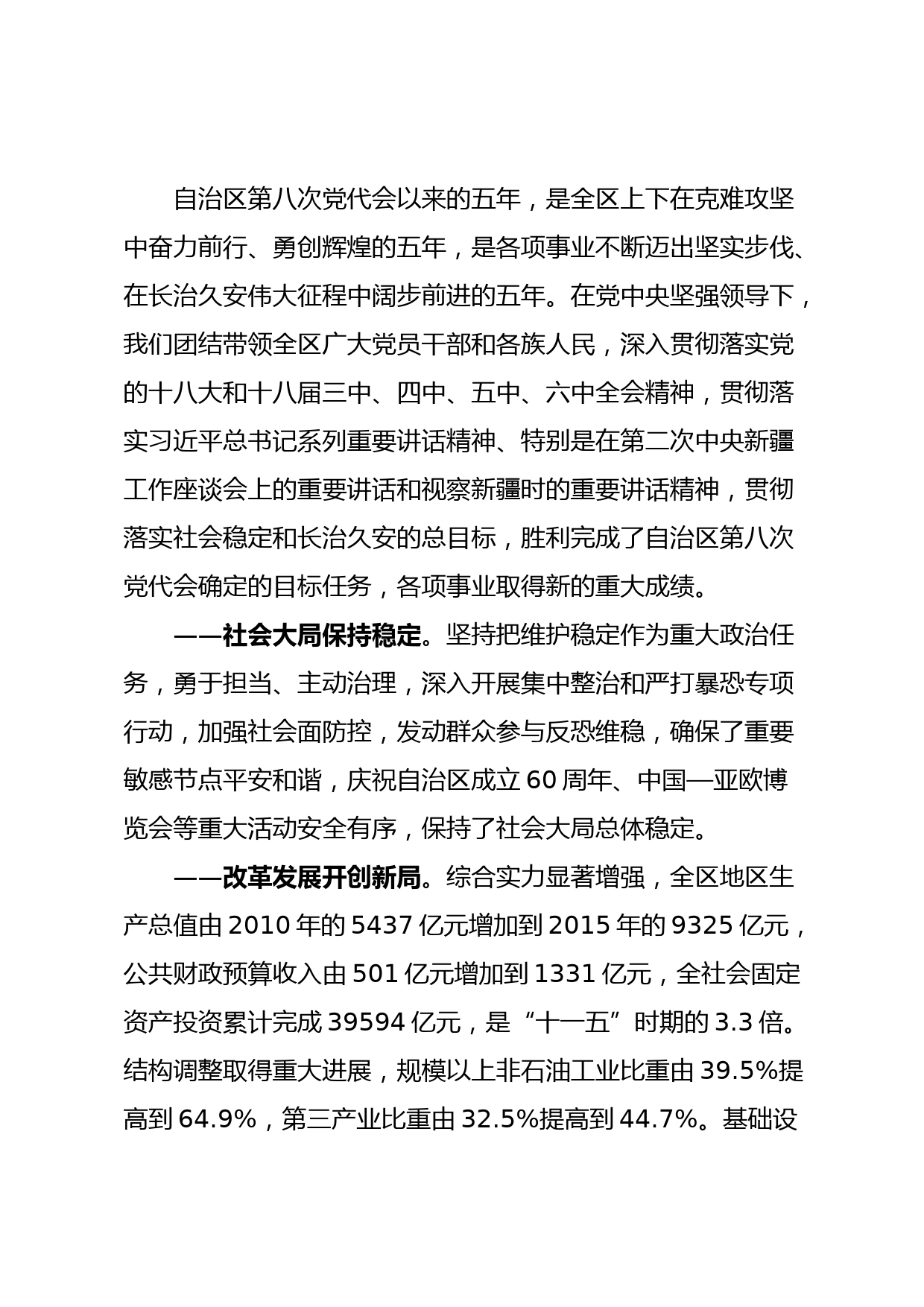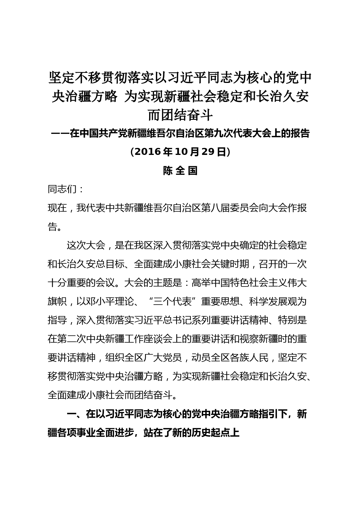 堅定不移貫徹落實以習近平同志為核心的黨中央治疆方略為實現(xiàn)新疆社會穩(wěn)定和長治久安而團結奮斗——在中國共產(chǎn)黨新疆維吾爾自治區(qū)第九次代表大會上的報告(2016年10月29日)陳全國同志們:現(xiàn)在,我代表中共新疆維吾爾自治區(qū)第八屆委員會向大會作報告。這次大會,是在我區(qū)深入貫徹落實黨中央確定的社會穩(wěn)定和長治久安總目標、全面建成小康社會關鍵時期,召開的一次十分重要的會議。大會的主題是:高舉中國特色社會主義偉大旗幟,以鄧小平理論、“三個代表”重要思想、科學發(fā)展觀為指導,深入貫徹落實習近平總書記系列重要講話精神、特別是在第二次中央新疆工作座談會上的重...