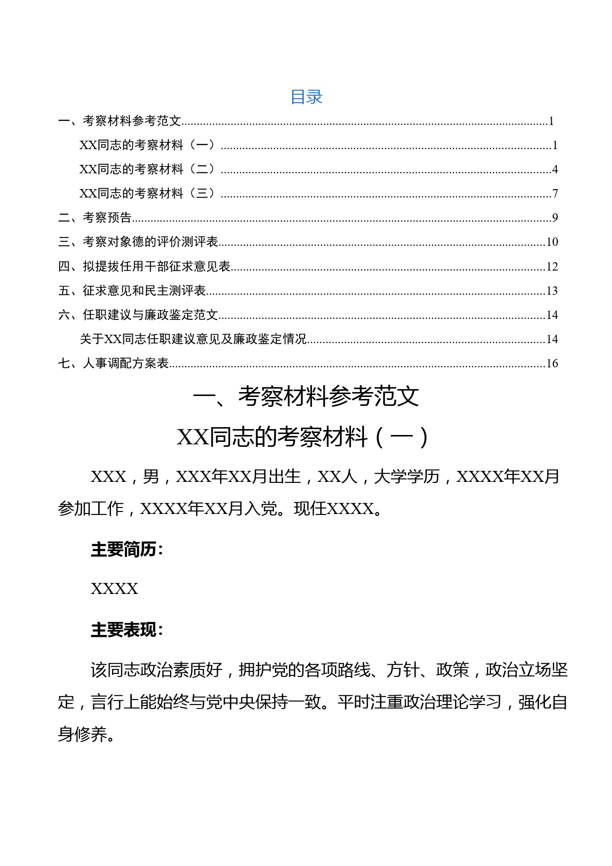 目錄一、考察材料參考范文.......................................................................................................................1XX同志的考察材料(一)...........................................................................................................1XX同志的考察材料(二)...........................................................................................................4XX同志的考察材料(三)...........................................................................................................