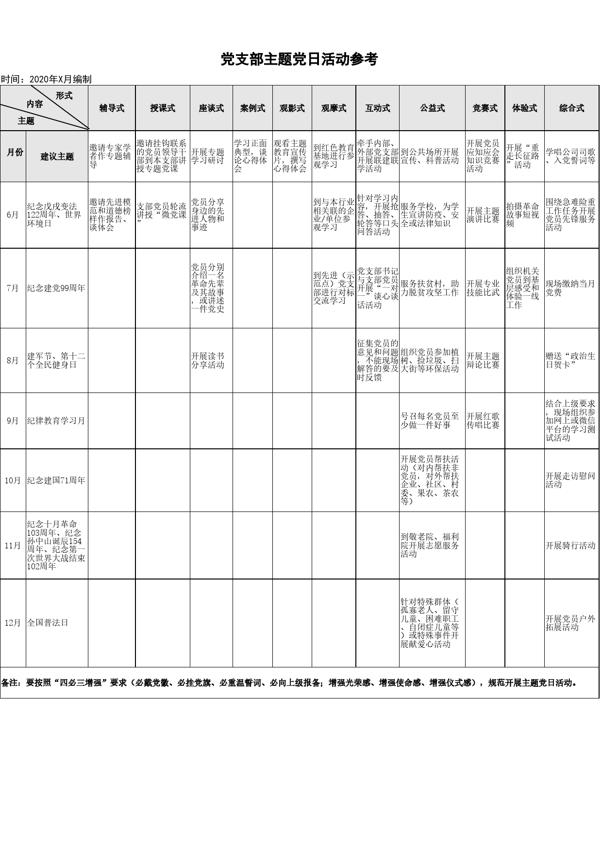 黨支部主題黨日活動(dòng)參考時(shí)間:2020年X月編制輔導(dǎo)式授課式座談式案例式觀影式觀摩式互動(dòng)式公益式競(jìng)賽式體驗(yàn)式綜合式形式內(nèi)容主題月份邀請(qǐng)專家學(xué)邀請(qǐng)掛鉤聯(lián)系開(kāi)展專題學(xué)習(xí)正面觀看主題到紅色教育牽手內(nèi)部、到公共場(chǎng)所開(kāi)展開(kāi)展黨員開(kāi)展“重學(xué)唱公司司歌的黨員領(lǐng)導(dǎo)干典型,談教育宣傳外部黨支部應(yīng)知應(yīng)會(huì)走長(zhǎng)征路、入黨誓詞等建議主題者作專題輔論心得體片,撰寫(xiě)基地進(jìn)行參知識(shí)競(jìng)賽”活動(dòng)導(dǎo)部到本支部講學(xué)習(xí)研討觀學(xué)習(xí)開(kāi)展聯(lián)建聯(lián)宣傳、科普活動(dòng)會(huì)心得體會(huì)活動(dòng)授專題黨課學(xué)活動(dòng)紀(jì)念戊戌變法邀請(qǐng)先進(jìn)模支部黨員輪流黨員分享到與本行業(yè)針對(duì)學(xué)習(xí)內(nèi)圍繞急難險(xiǎn)重范和道德榜身邊的先...