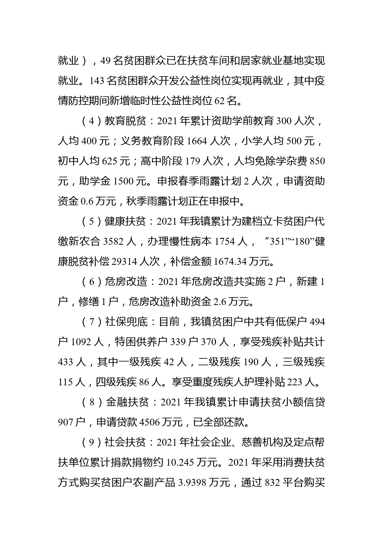 鹿城鎮(zhèn)2021年脫貧攻堅(jiān)工作總結(jié)及2021年工作計(jì)劃一、基本情況鹿城鎮(zhèn)處于阜南縣政治經(jīng)濟(jì)文化中心,下轄28個(gè)村居社區(qū),有扶貧任務(wù)的村(居)社區(qū)16個(gè),其中貧困村3個(gè),非貧困村13個(gè),2014年建檔立卡時(shí)共有貧困戶2526戶9256人,總?cè)丝跒?6385人,當(dāng)年貧困發(fā)生率為12.1%。目前我鎮(zhèn)共有建檔立卡貧困戶2265戶7247人,總?cè)丝?8637人,其中2014年至2019年已累計(jì)脫貧2256戶7227人,2021年脫貧9戶20人。截至目前,我鎮(zhèn)的貧困發(fā)生率為0。三個(gè)貧困村劉樓村、趙莊村、腰莊村已分別于2016年、2017年、2018年順利出列。二、脫貧攻堅(jiān)重大政策措施、重點(diǎn)工作落實(shí)情祝(一)脫貧攻堅(jiān)各項(xiàng)措施...