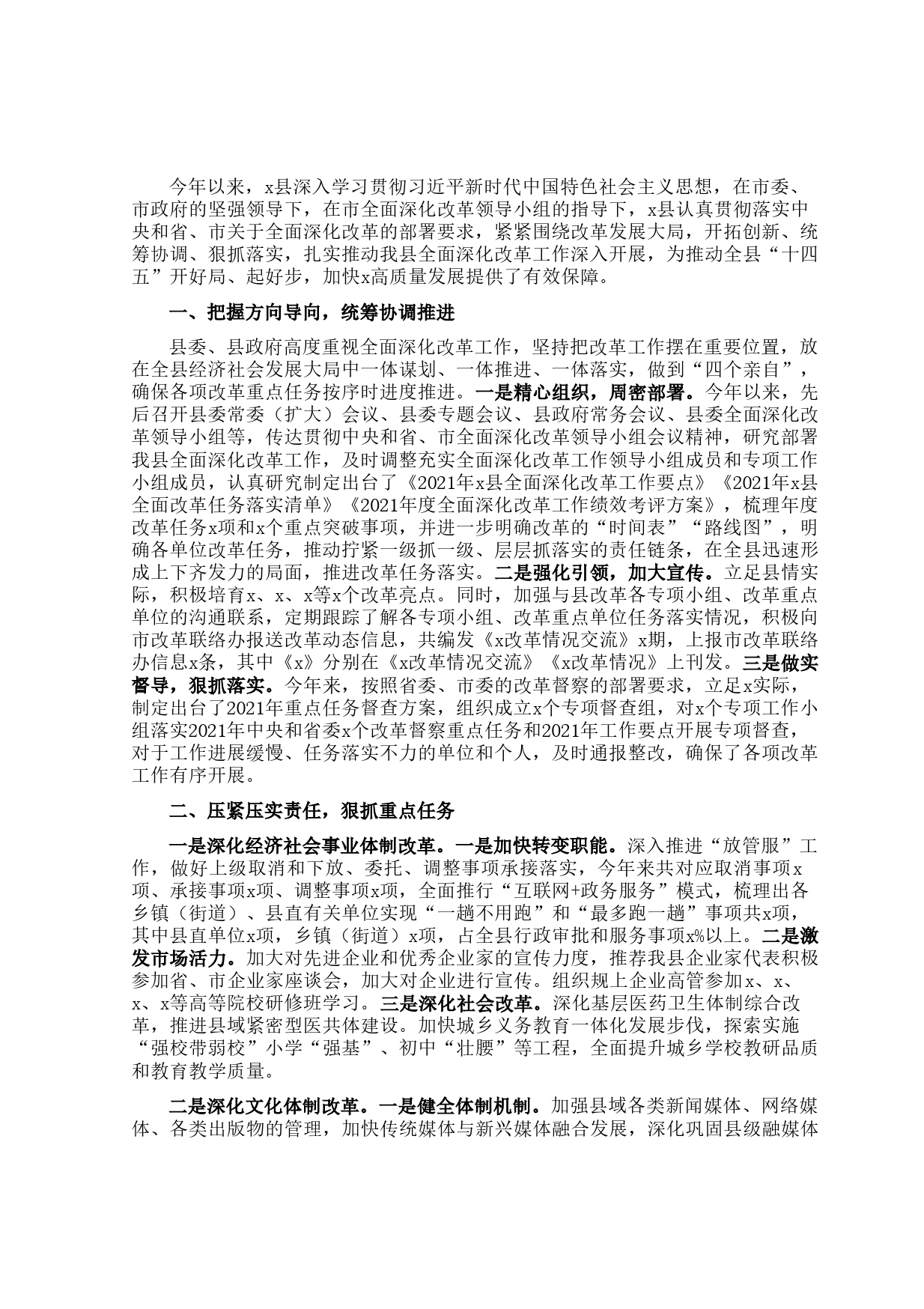 今年以來,x縣深入學習貫徹習近平新時代中國特色社會主義思想,在市委、市政府的堅強領導下,在市全面深化改革領導小組的指導下,x縣認真貫徹落實中央和省、市關于全面深化改革的部署要求,緊緊圍繞改革發(fā)展大局,開拓創(chuàng)新、統(tǒng)籌協(xié)調(diào)、狠抓落實,扎實推動我縣全面深化改革工作深入開展,為推動全縣“十四五”開好局、起好步,加快x高質(zhì)量發(fā)展提供了有效保障。一、把握方向?qū)?,統(tǒng)籌協(xié)調(diào)推進縣委、縣政府高度重視全面深化改革工作,堅持把改革工作擺在重要位置,放在全縣經(jīng)濟社會發(fā)展大局中一體謀劃、一體推進、一體落實,做到“四個親自”,確保各項改革重點任務按序時...