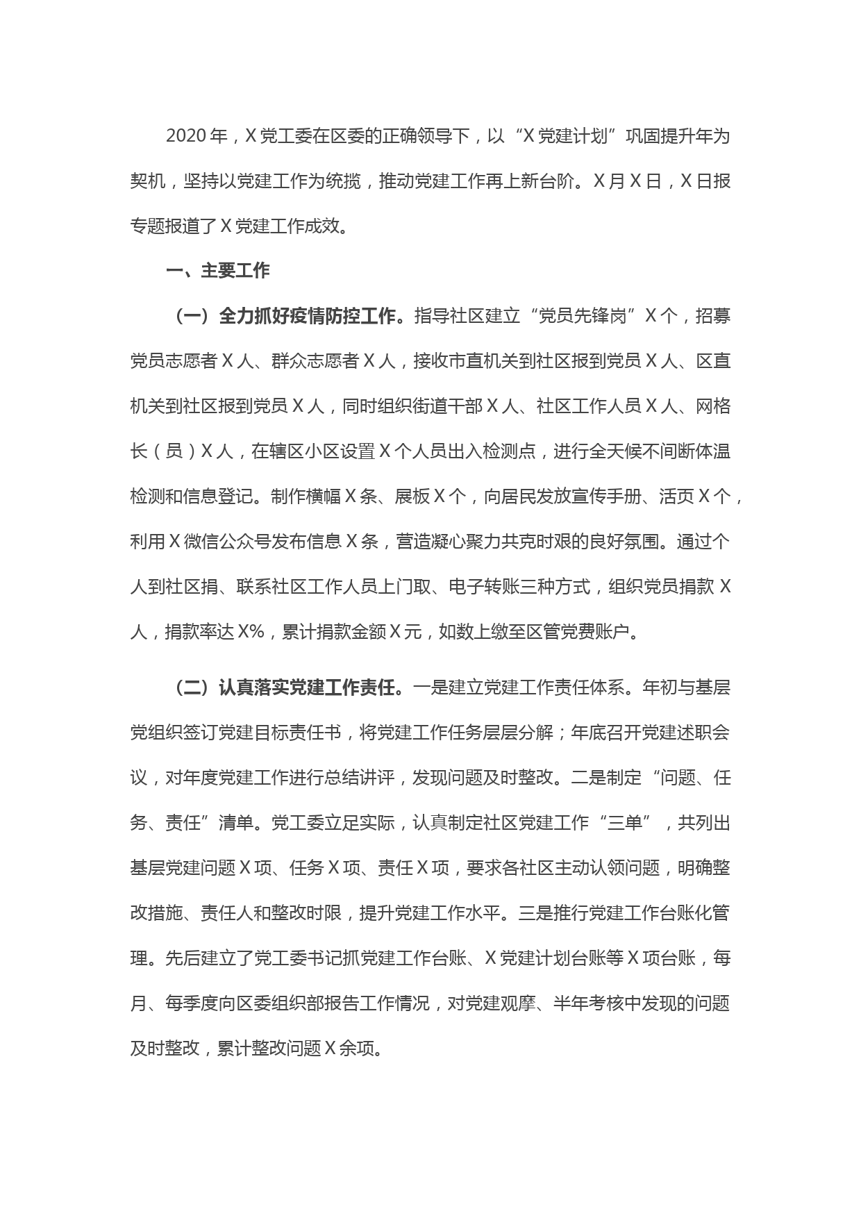 2020年,X黨工委在區(qū)委的正確領(lǐng)導(dǎo)下,以“X黨建計劃”鞏固提升年為契機,堅持以黨建工作為統(tǒng)攬,推動黨建工作再上新臺階。X月X日,X日報專題報道了X黨建工作成效。一、主要工作(一)全力抓好疫情防控工作。指導(dǎo)社區(qū)建立“黨員先鋒崗”X個,招募黨員志愿者X人、群眾志愿者X人,接收市直機關(guān)到社區(qū)報到黨員X人、區(qū)直機關(guān)到社區(qū)報到黨員X人,同時組織街道干部X人、社區(qū)工作人員X人、網(wǎng)格長(員)X人,在轄區(qū)小區(qū)設(shè)置X個人員出入檢測點,進行全天候不間斷體溫檢測和信息登記。制作橫幅X條、展板X個,向居民發(fā)放宣傳手冊、活頁X個,利用X微信公眾號發(fā)布信息X條,營造凝心聚力...