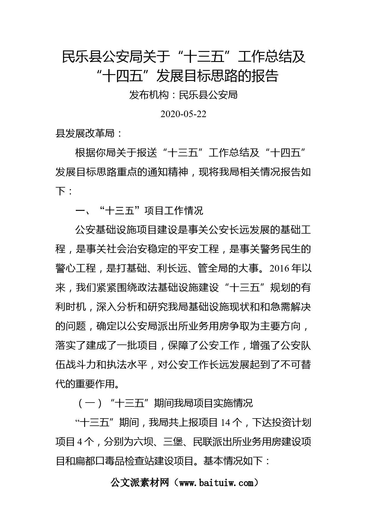 民樂縣公安局關(guān)于“十三五”工作總結(jié)及“十四五”發(fā)展目標(biāo)思路的報(bào)告發(fā)布機(jī)構(gòu):民樂縣公安局2020-05-22縣發(fā)展改革局:根據(jù)你局關(guān)于報(bào)送“十三五”工作總結(jié)及“十四五”發(fā)展目標(biāo)思路重點(diǎn)的通知精神,現(xiàn)將我局相關(guān)情況報(bào)告如下:一、“十三五”項(xiàng)目工作情況公安基礎(chǔ)設(shè)施項(xiàng)目建設(shè)是事關(guān)公安長遠(yuǎn)發(fā)展的基礎(chǔ)工程,是事關(guān)社會治安穩(wěn)定的平安工程,是事關(guān)警務(wù)民生的警心工程,是打基礎(chǔ)、利長遠(yuǎn)、管全局的大事。2016年以來,我們緊緊圍繞政法基礎(chǔ)設(shè)施建設(shè)“十三五”規(guī)劃的有利時(shí)機(jī),深入分析和研究我局基礎(chǔ)設(shè)施現(xiàn)狀和和急需解決的問題,確定以公安局派出所業(yè)務(wù)用房爭取為主要方向...